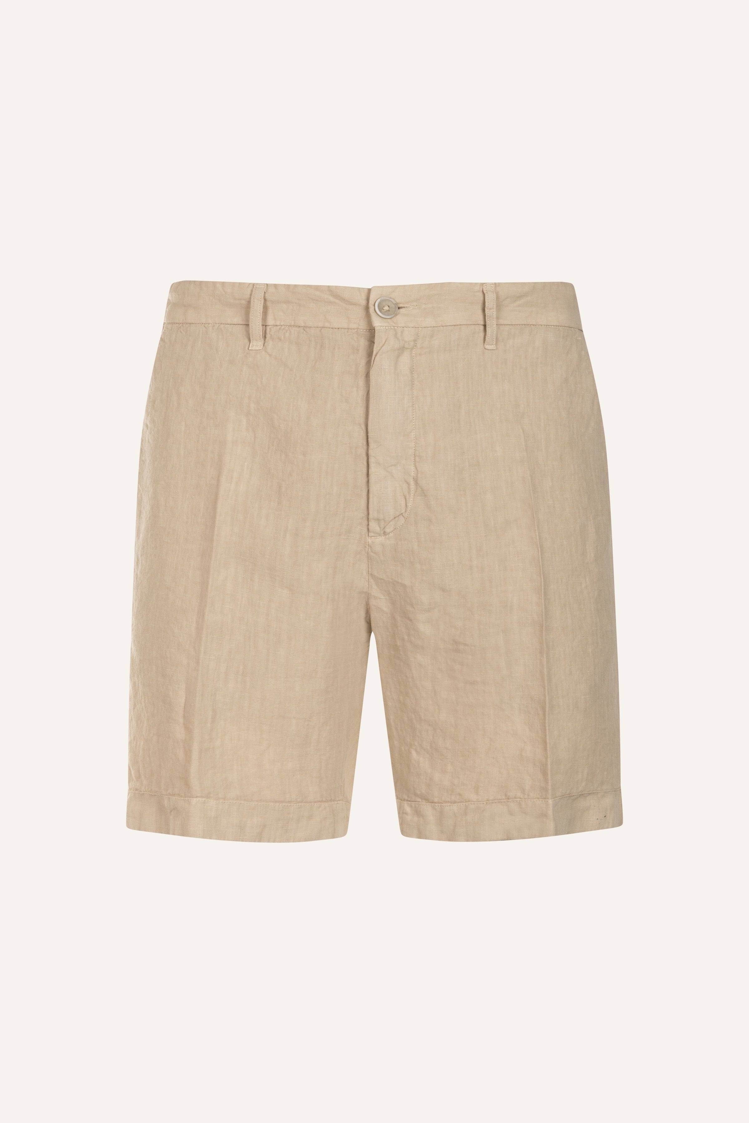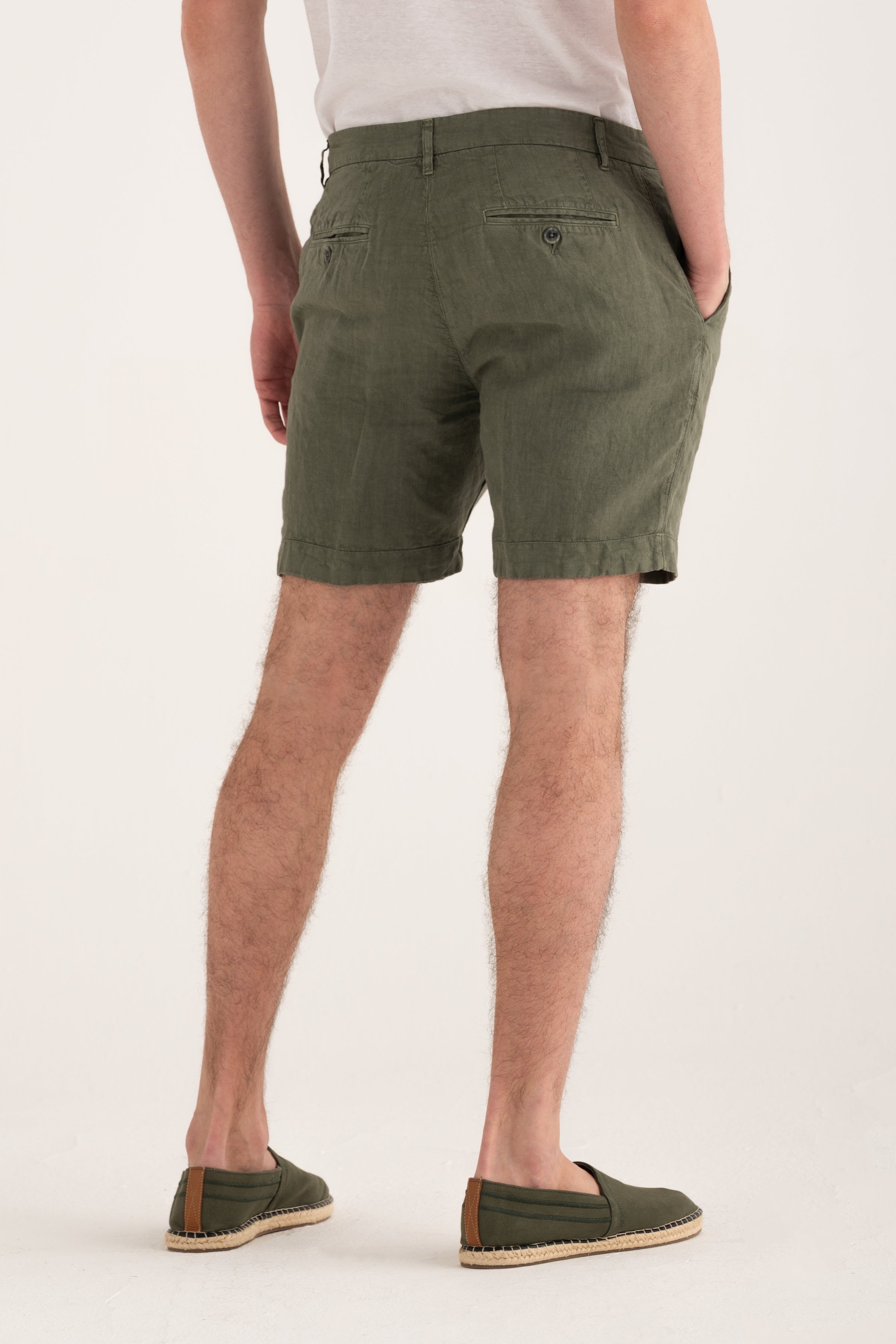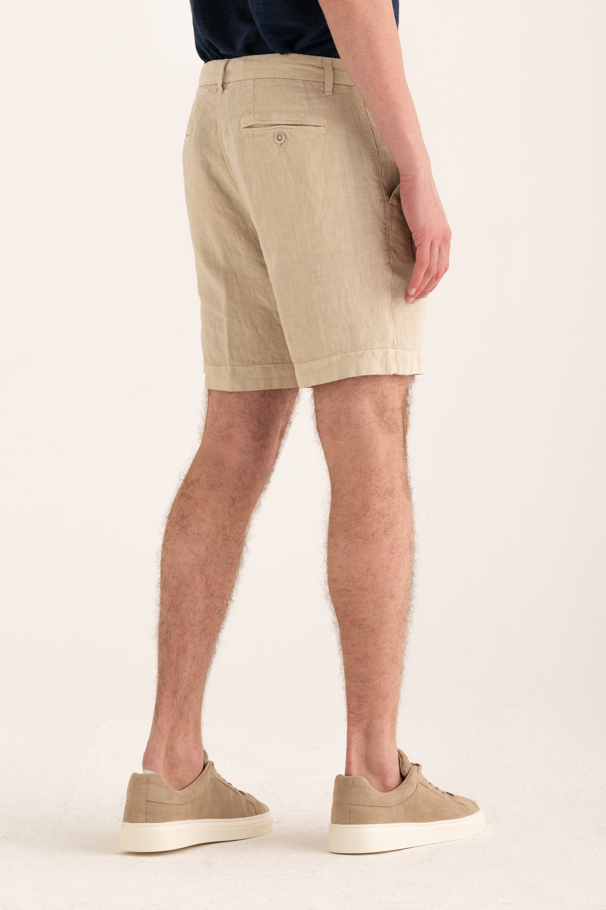 Clean-cut shorts that reinterpret relaxed summer elegance. Crafted from pure linen, they offer comfort and breathability while maintaining a neat structure thanks to their chino-inspired design. Side pockets and back welt pockets with buttons complete a versatile look suitable for both casual and refined outfits.