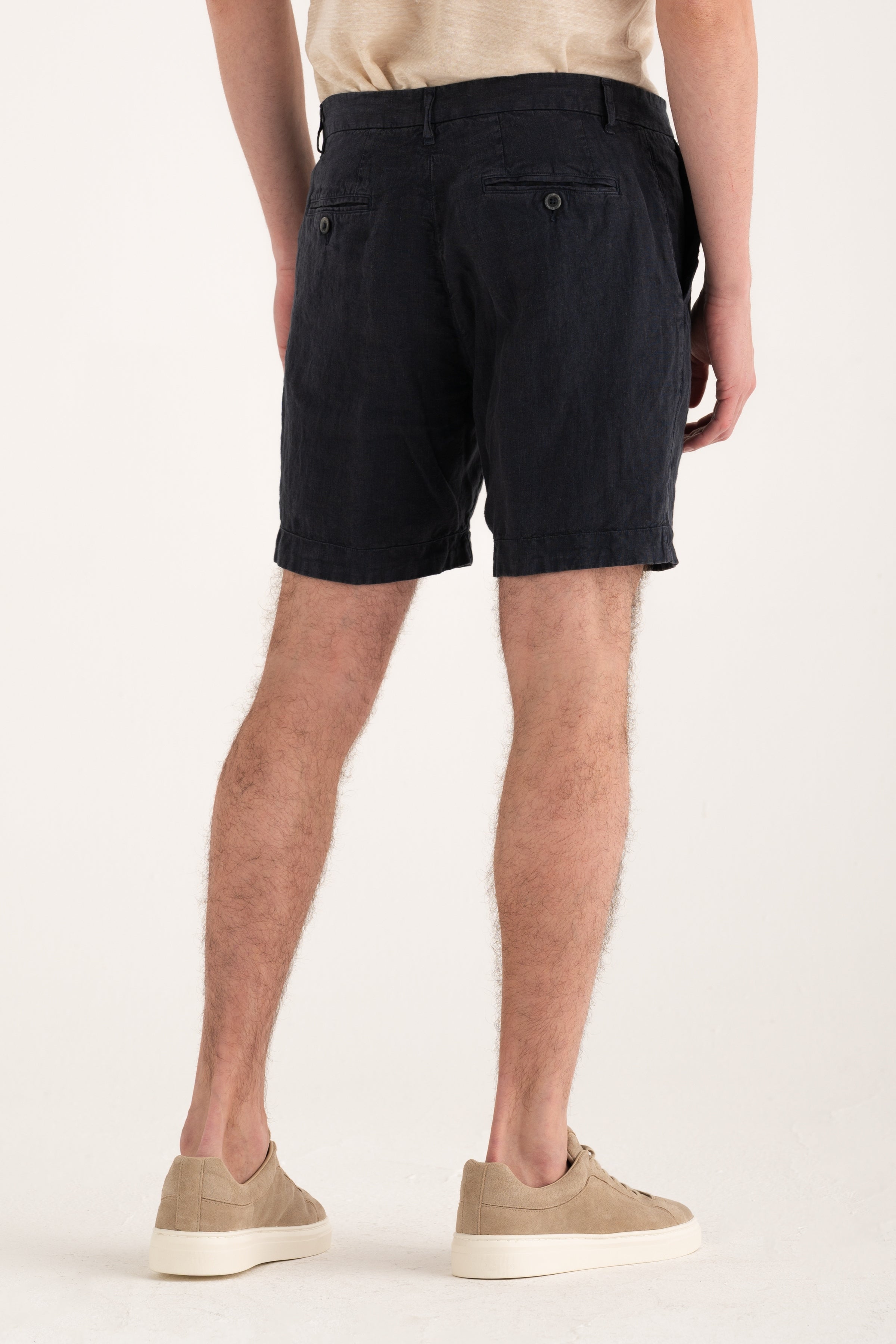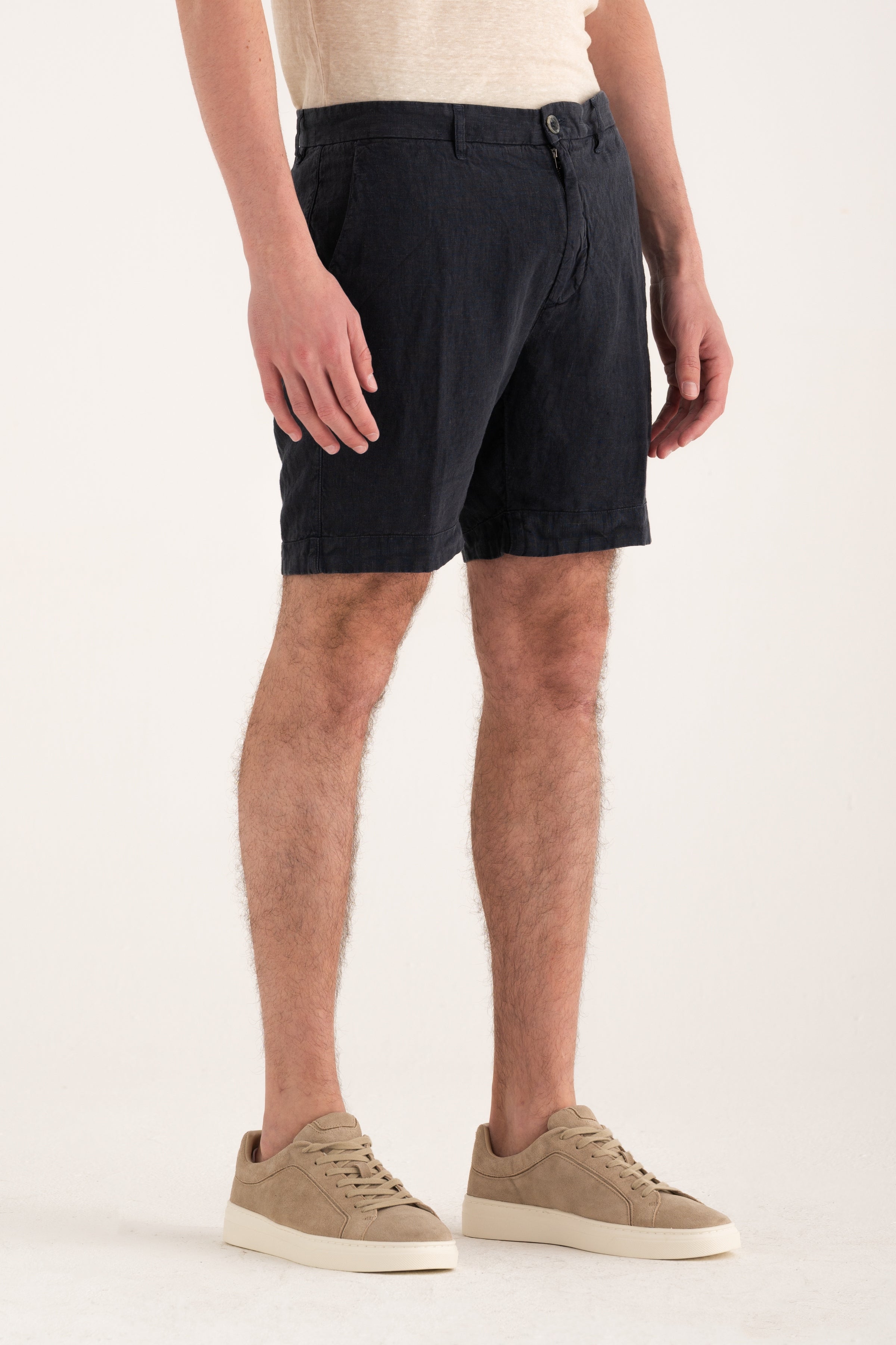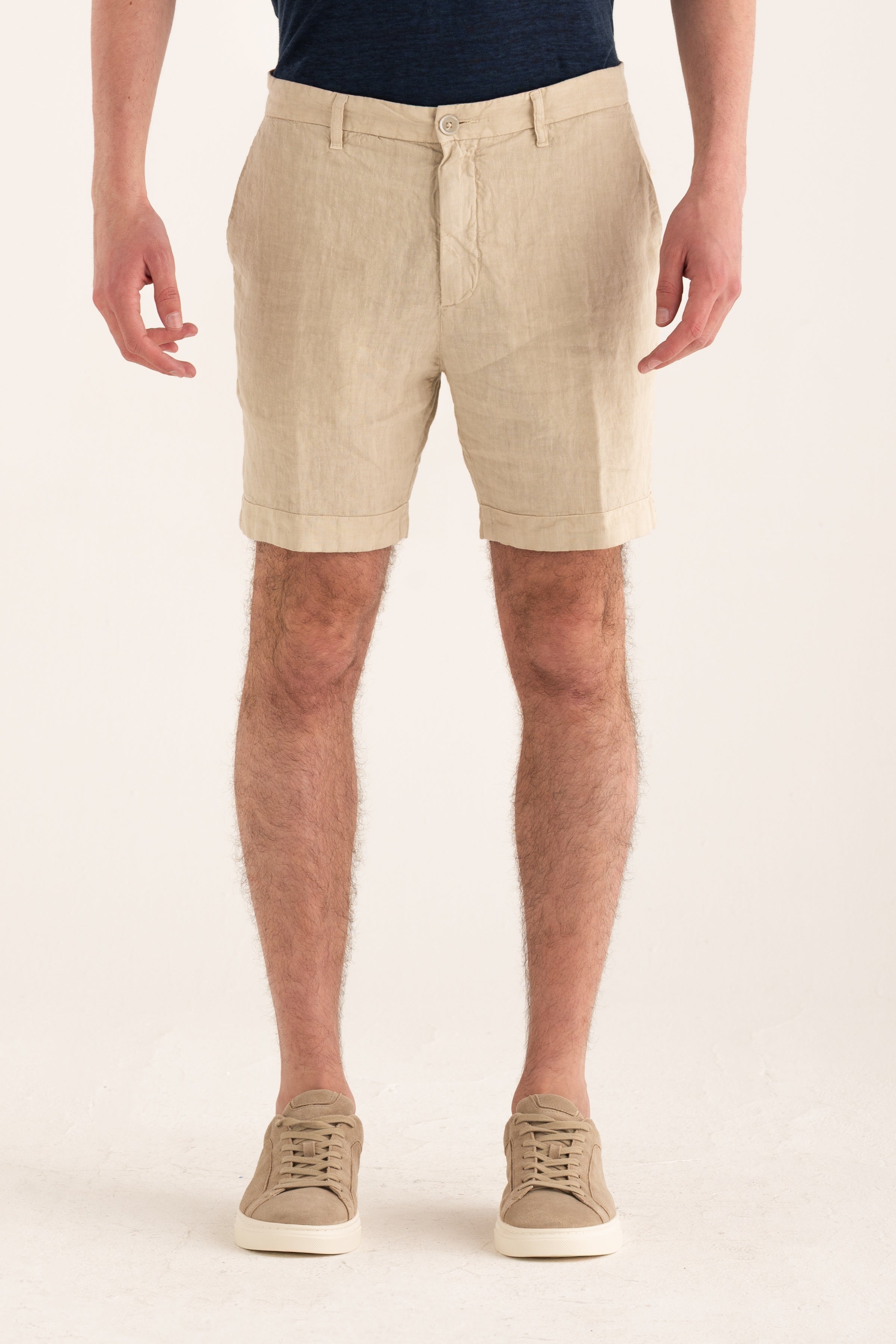 Clean-cut shorts that reinterpret relaxed summer elegance. Crafted from pure linen, they offer comfort and breathability while maintaining a neat structure thanks to their chino-inspired design. Side pockets and back welt pockets with buttons complete a versatile look suitable for both casual and refined outfits.