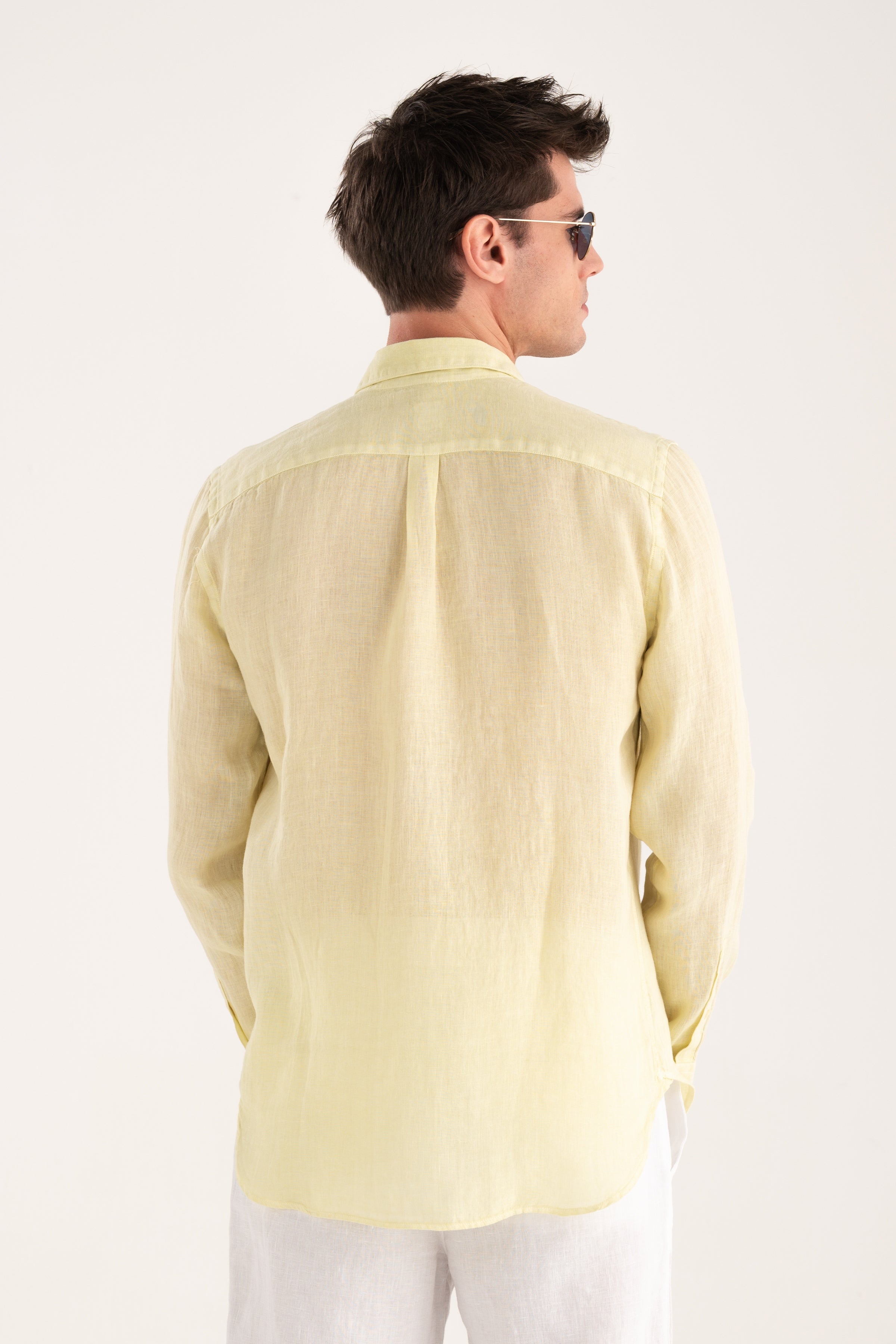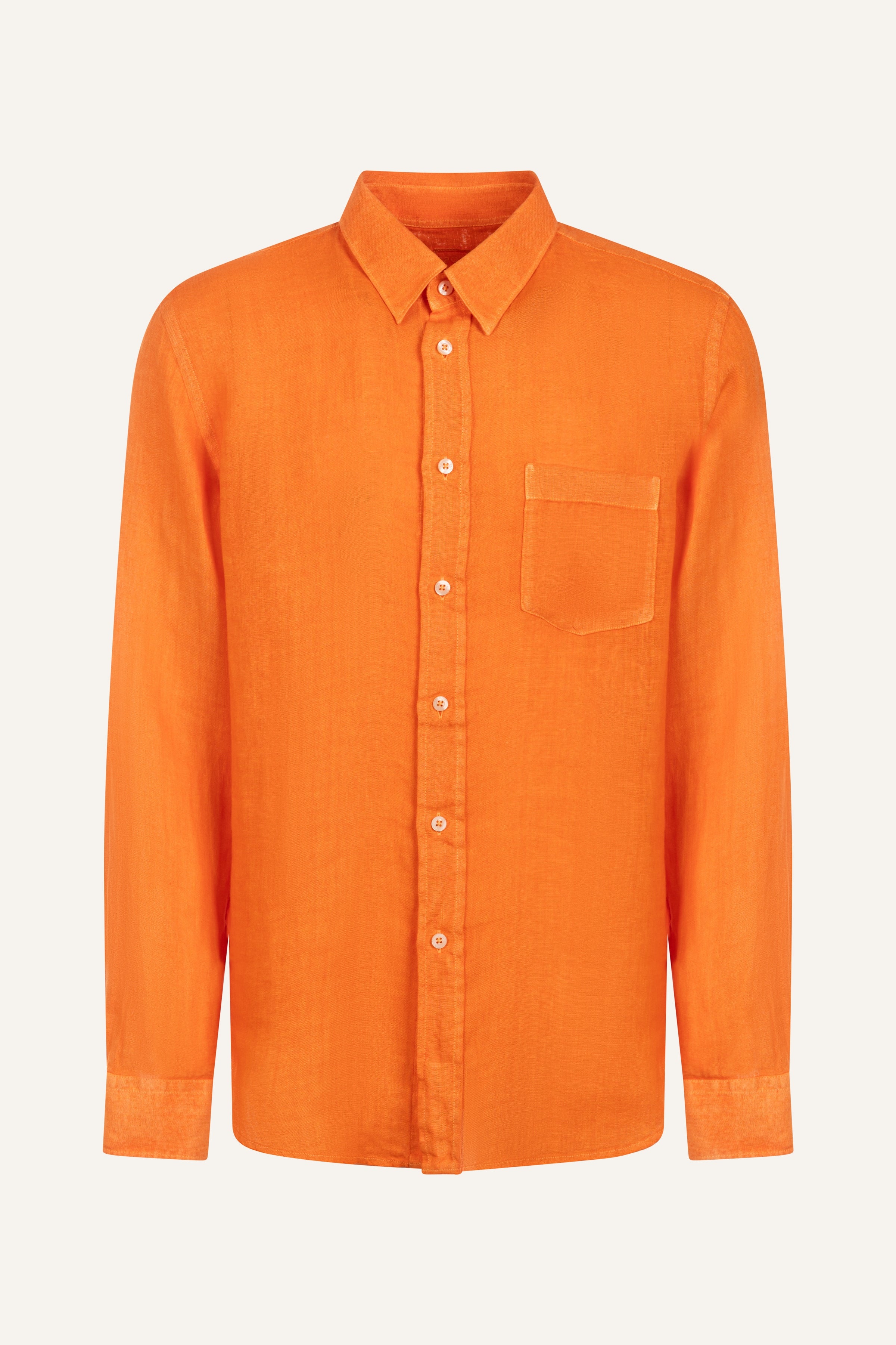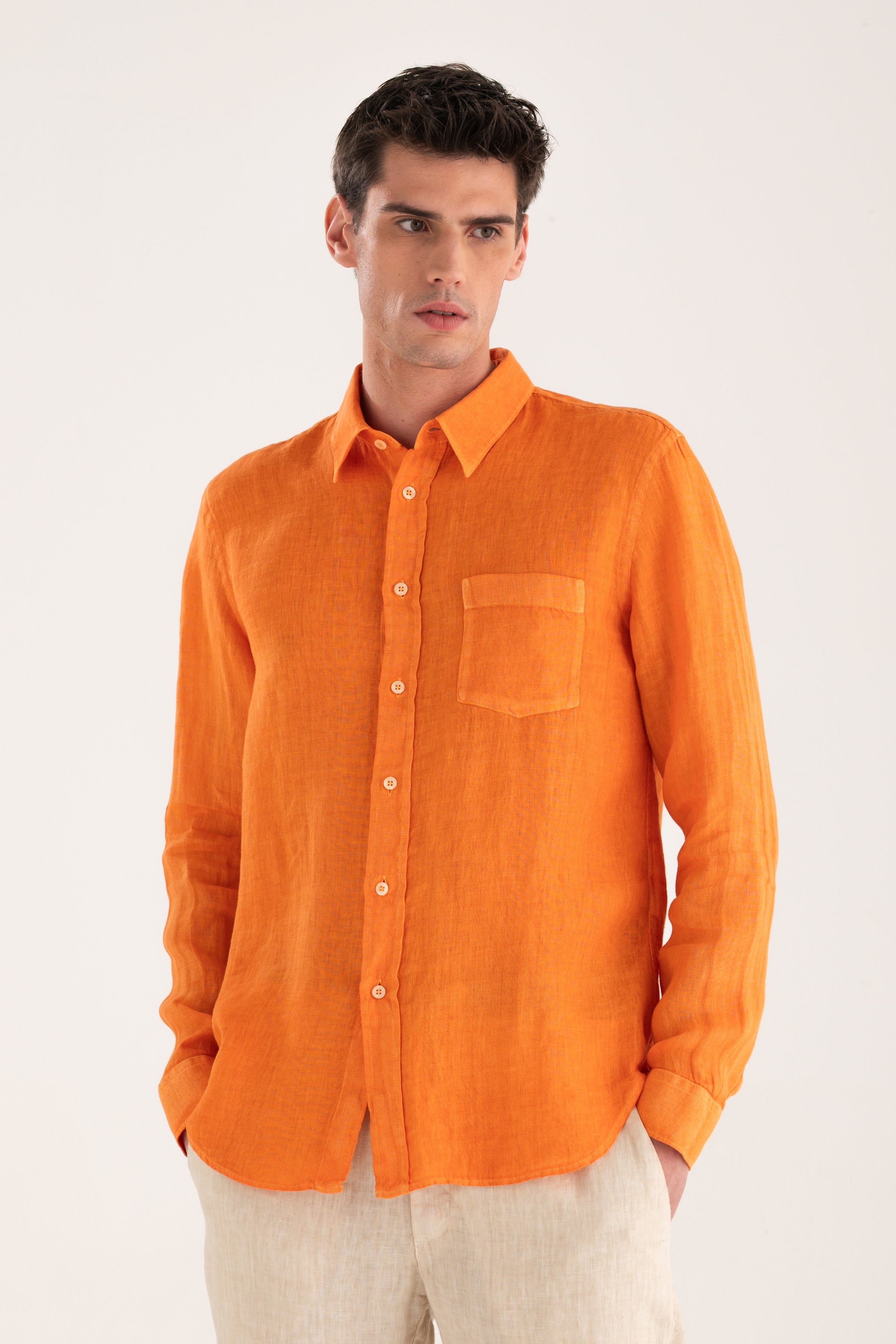 A shirt with a balanced, regular silhouette that combines comfort and refined simplicity. The clean design, featuring a classic collar and chest pocket, makes it a versatile wardrobe staple. Crafted from pure linen, it ensures a naturally lightweight and breathable feel, ideal for the warmer season.