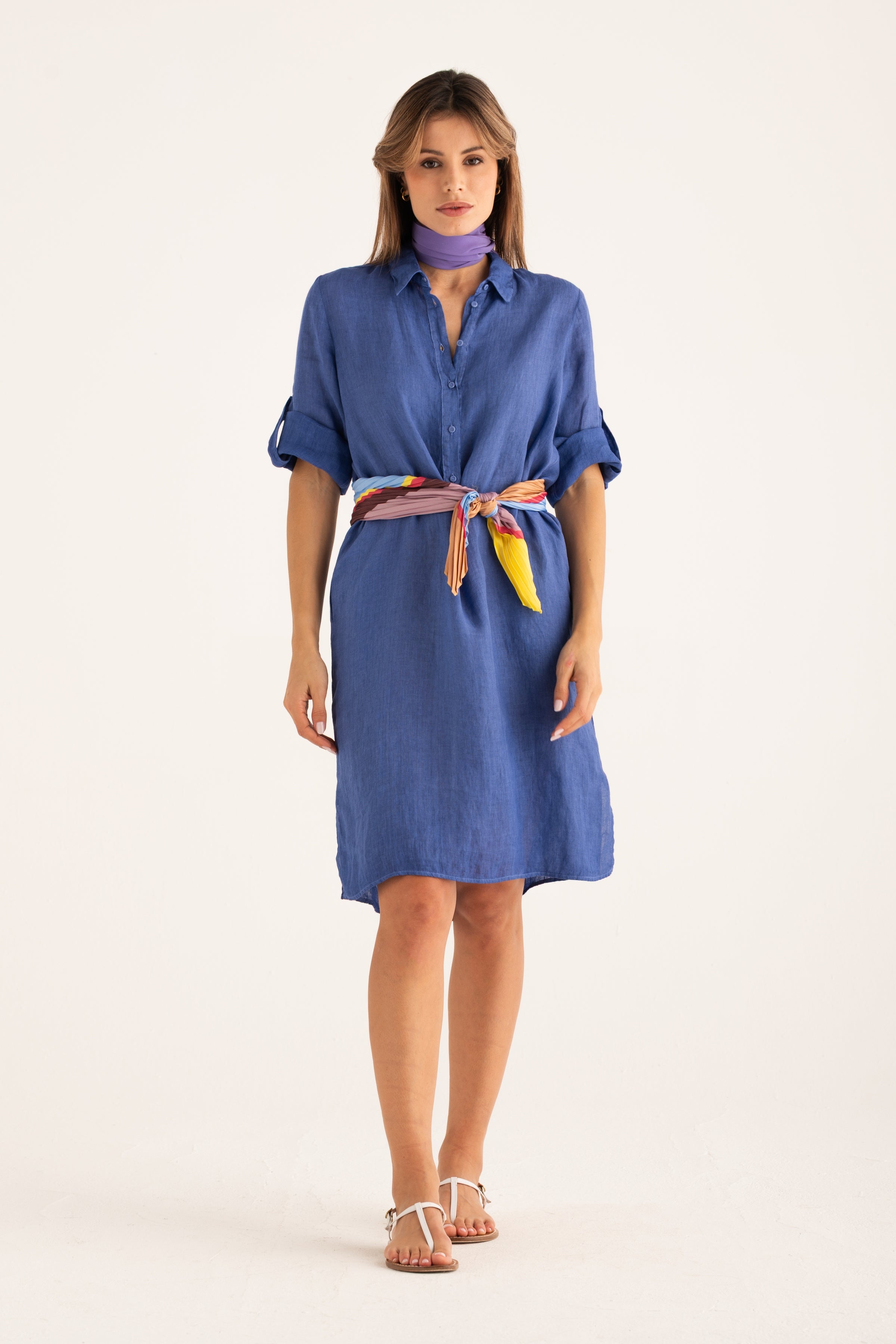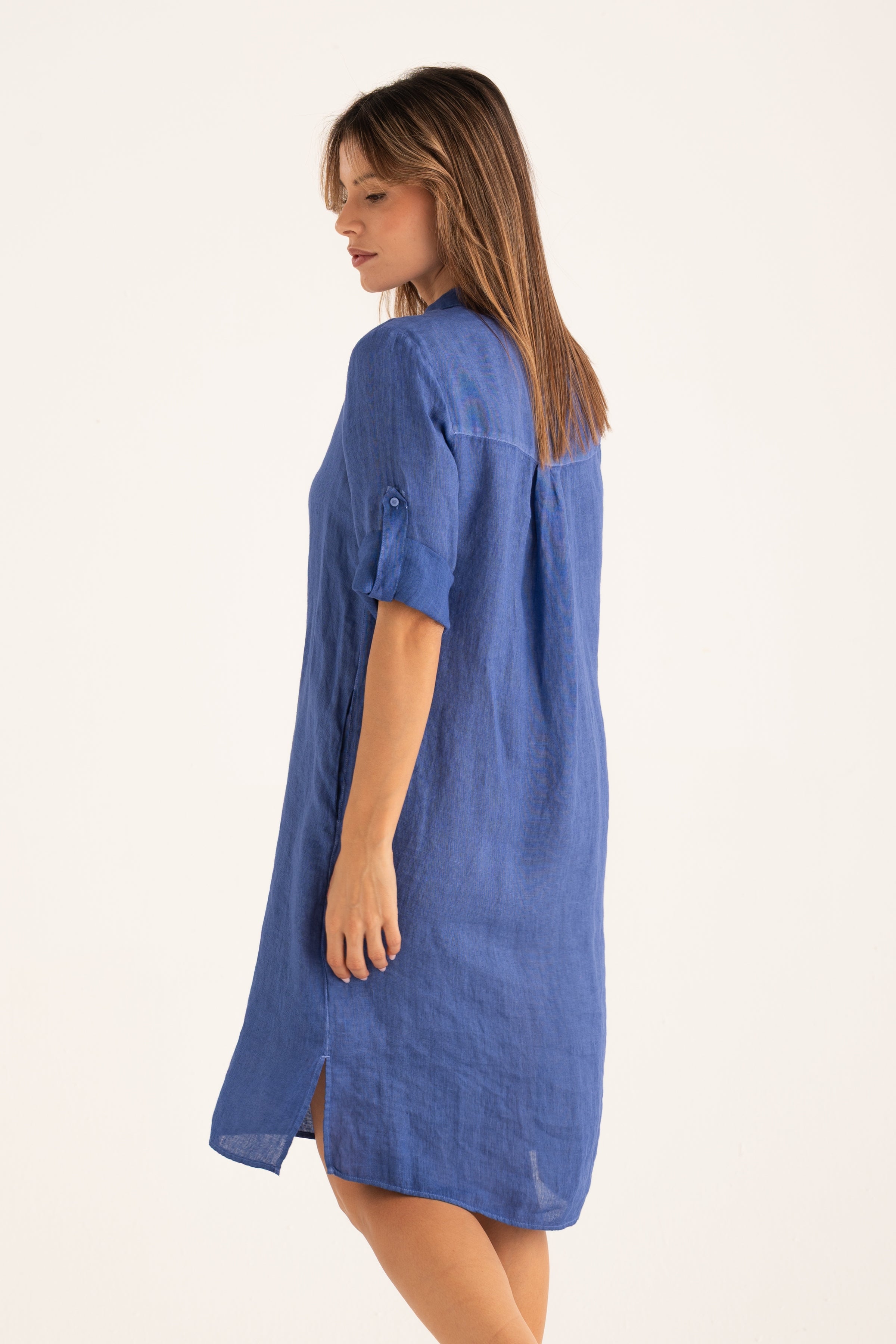 Dress in pure linen with a relaxed silhouette and polo neckline, designed to highlight the natural lightness of the fiber. The roll-up sleeves with button tab and the fluid construction follow the body with ease, while the side pockets add practicality without compromising its effortless elegance.