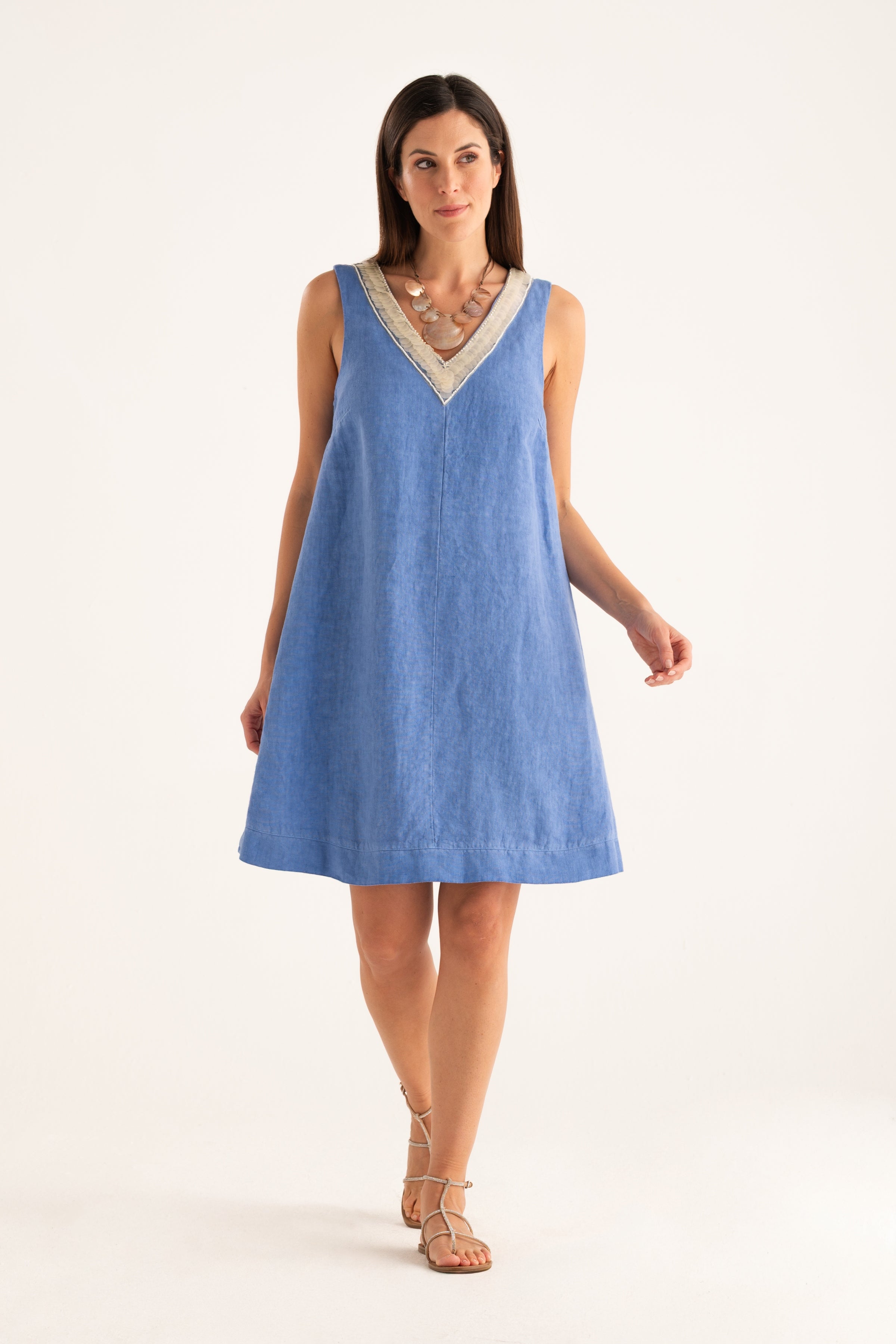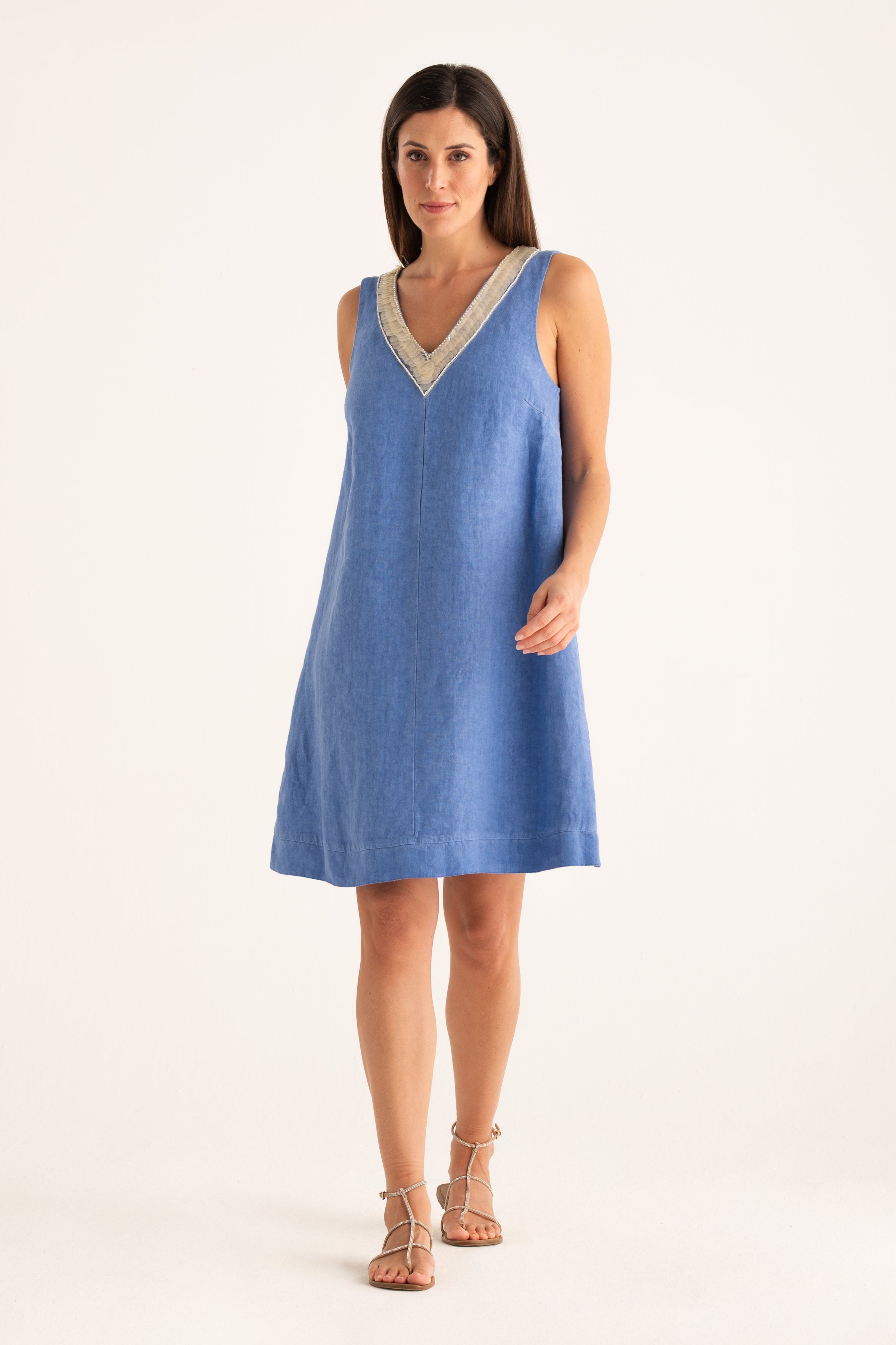 Sleeveless dress with a gently flared silhouette, defined by an embellished V-neckline that adds subtle shine while keeping the look refined. The relaxed fit enhances the natural shape, and a small back opening with button makes it easy to slip on. A fresh, versatile piece designed to elevate everyday dressing with a touch of crafted detail.