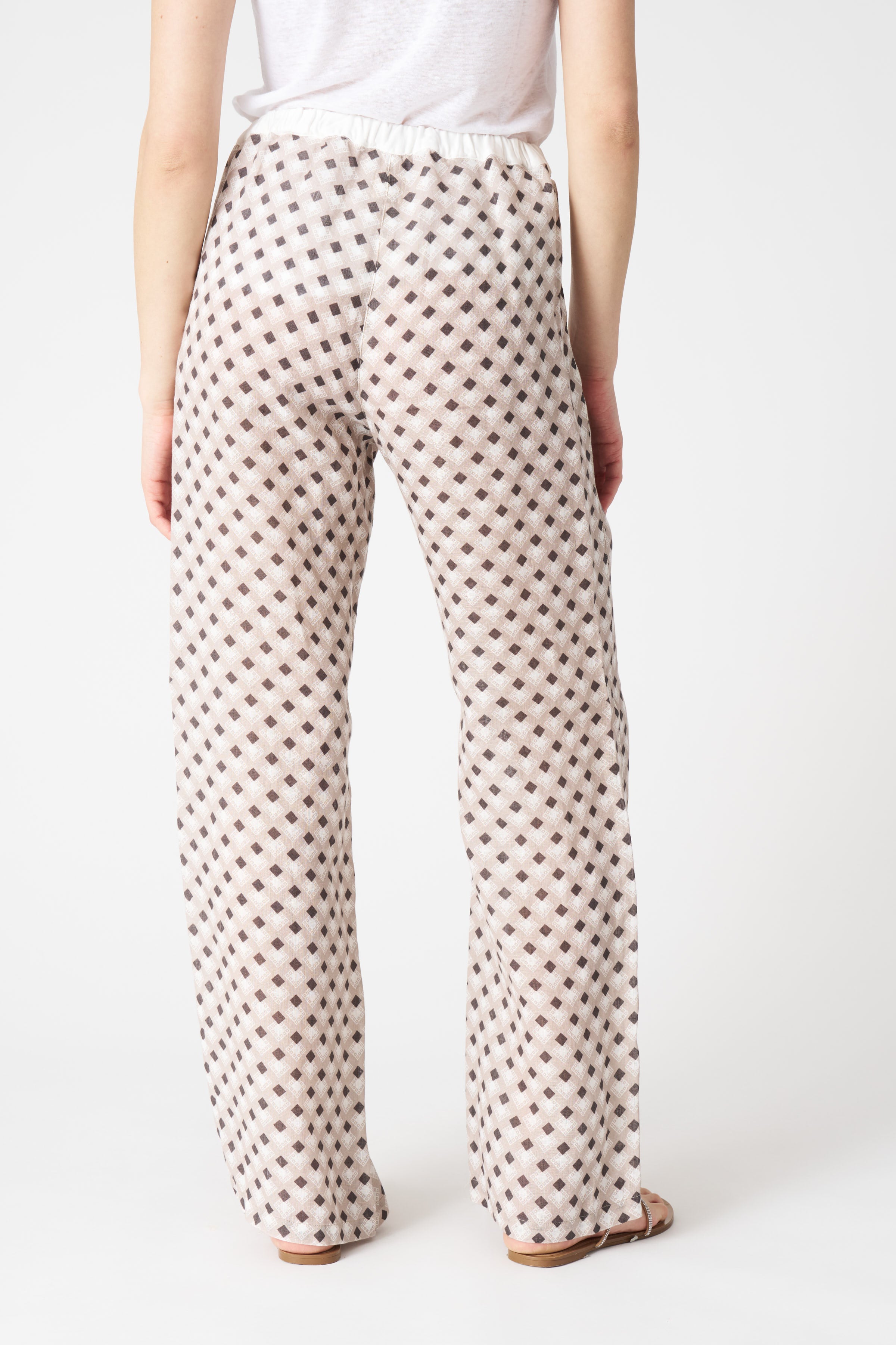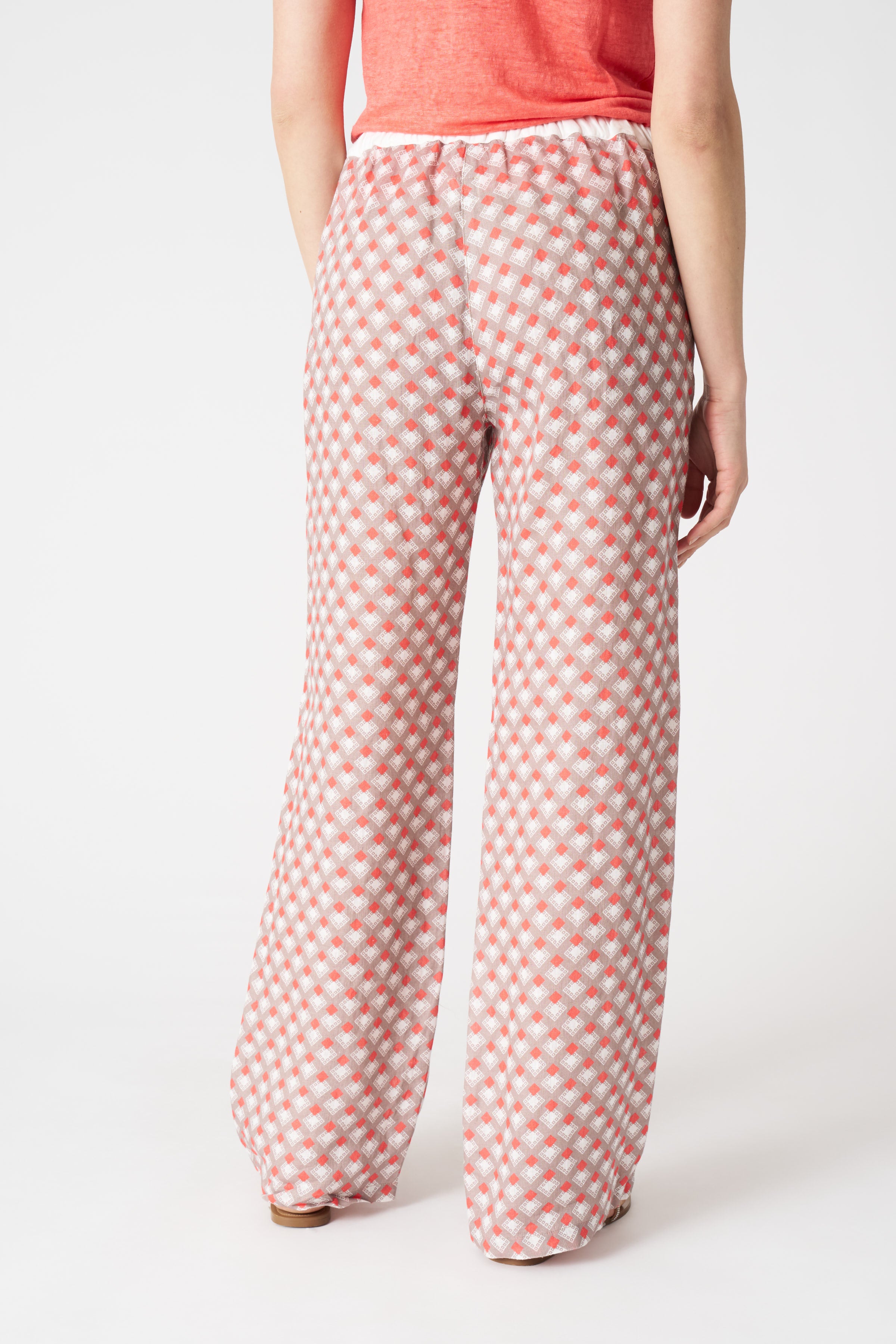 Fluid lines and a relaxed spirit. These long pants move lightly with every step and add a graphic touch to your wardrobe thanks to the geometric pattern. The drawstring waistband offers comfort and versatility, making them perfect for moments of freedom, between leisure time and light travels.