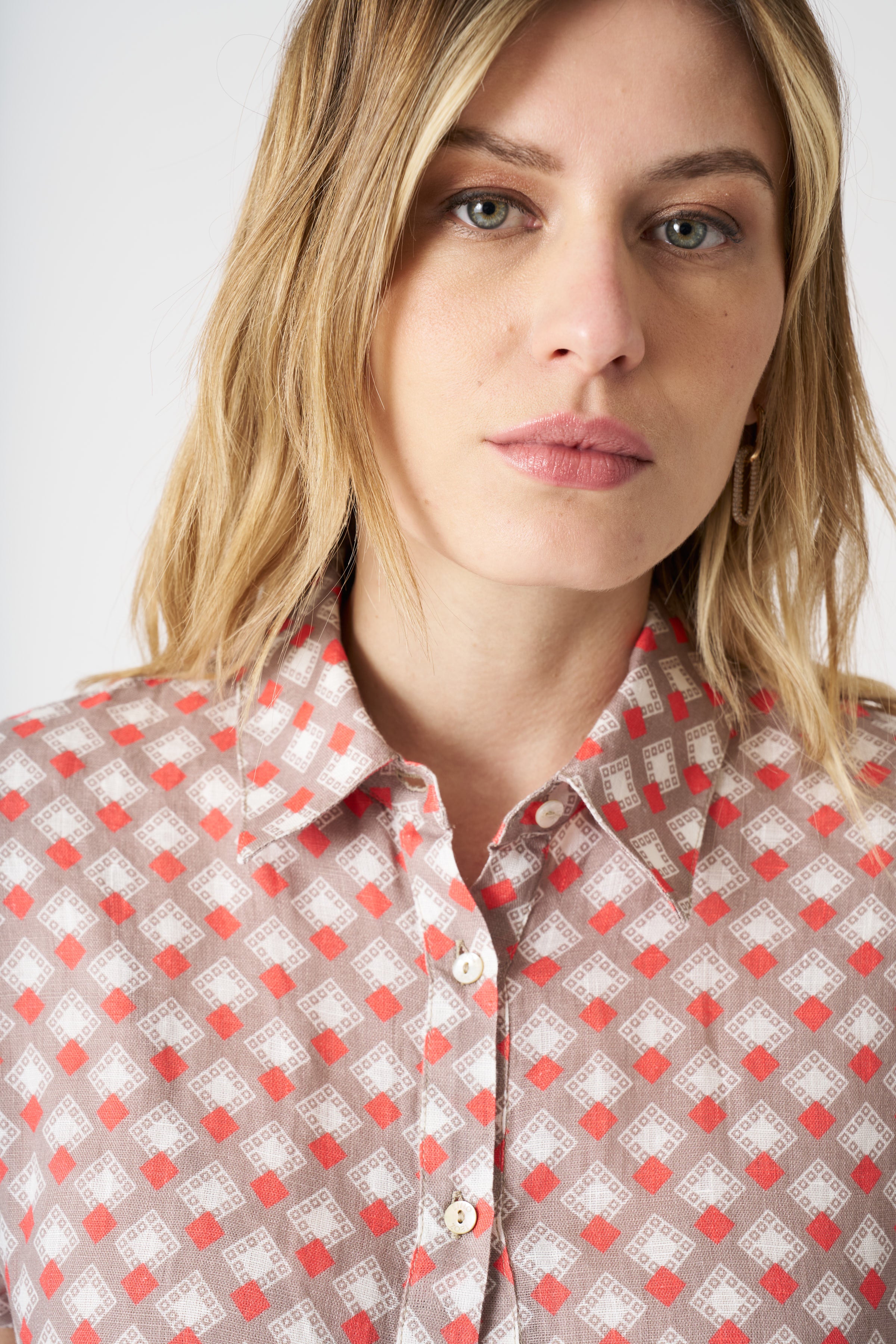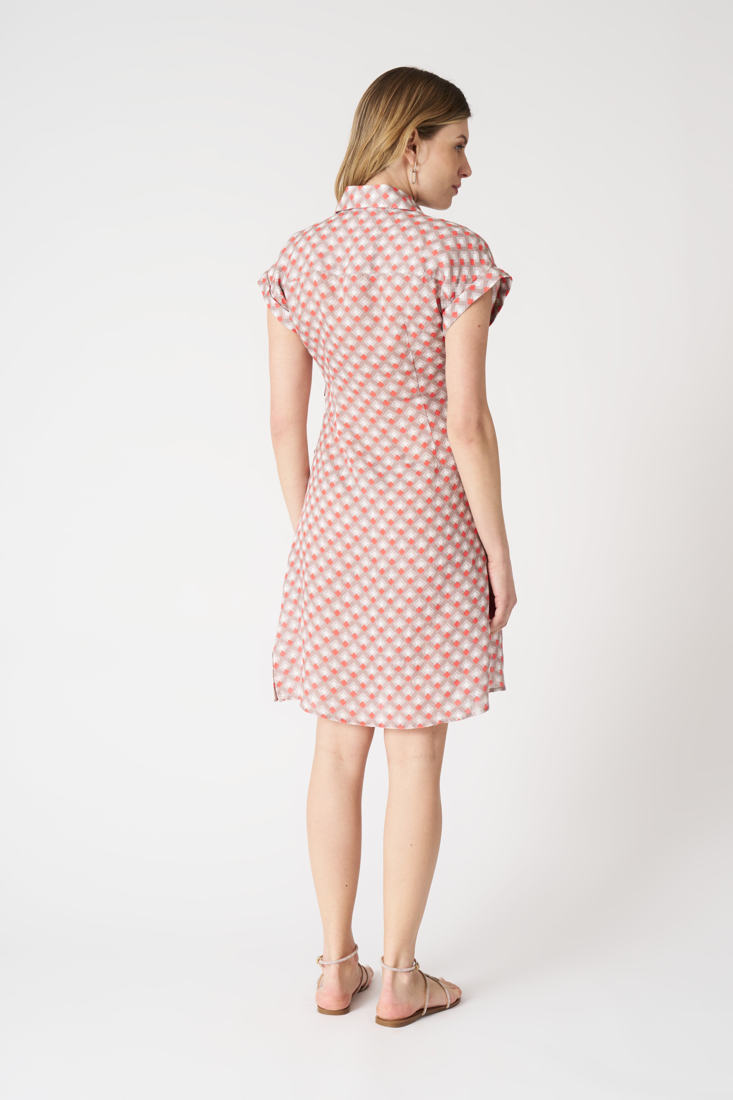 A dress that plays with movement and contrast: the draped knot at the waist defines the silhouette with natural elegance, while the geometric pattern adds rhythm and character. The short sleeves and shirt collar make it a versatile piece, ideal from morning to evening, with a light, fresh feel that never tires.