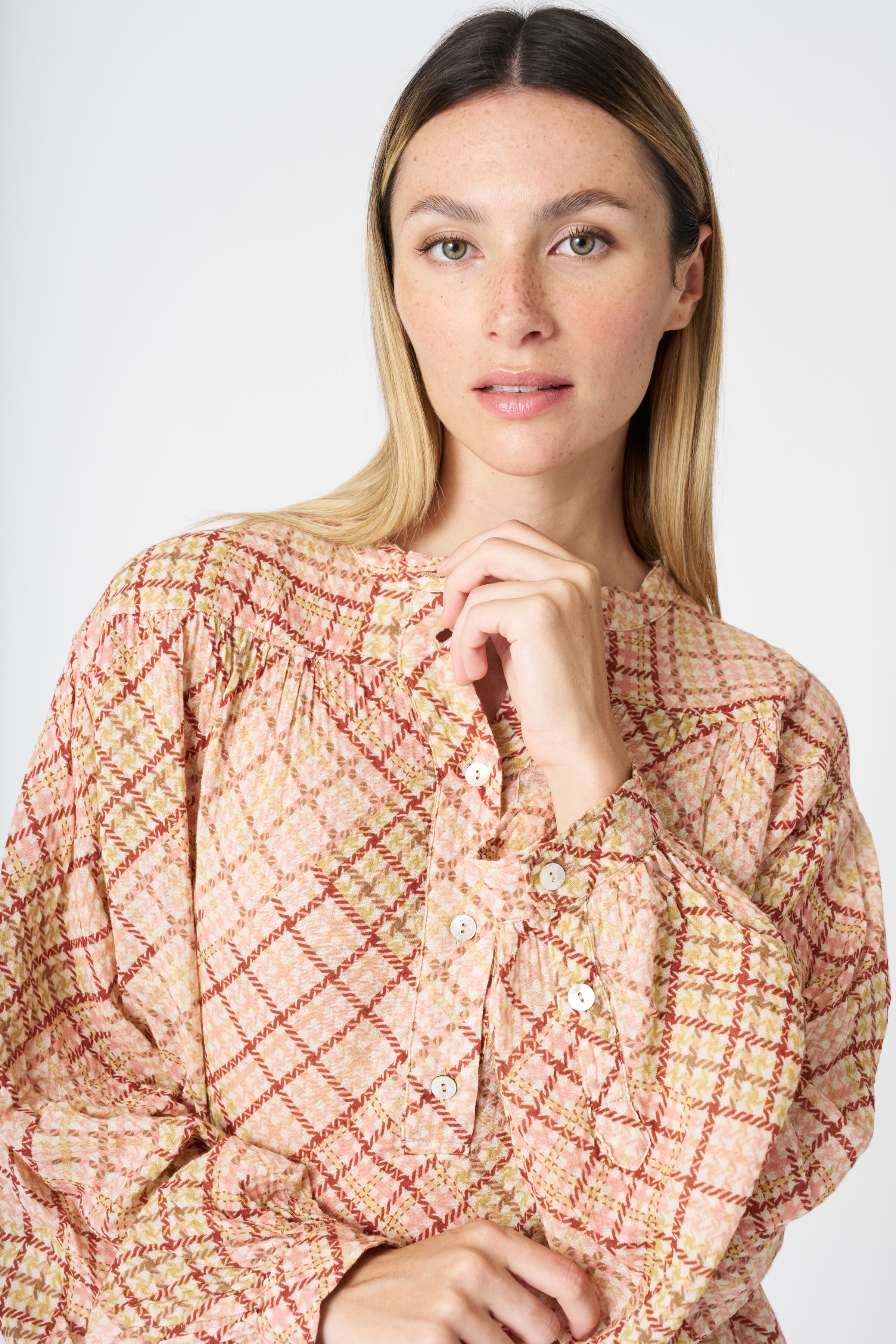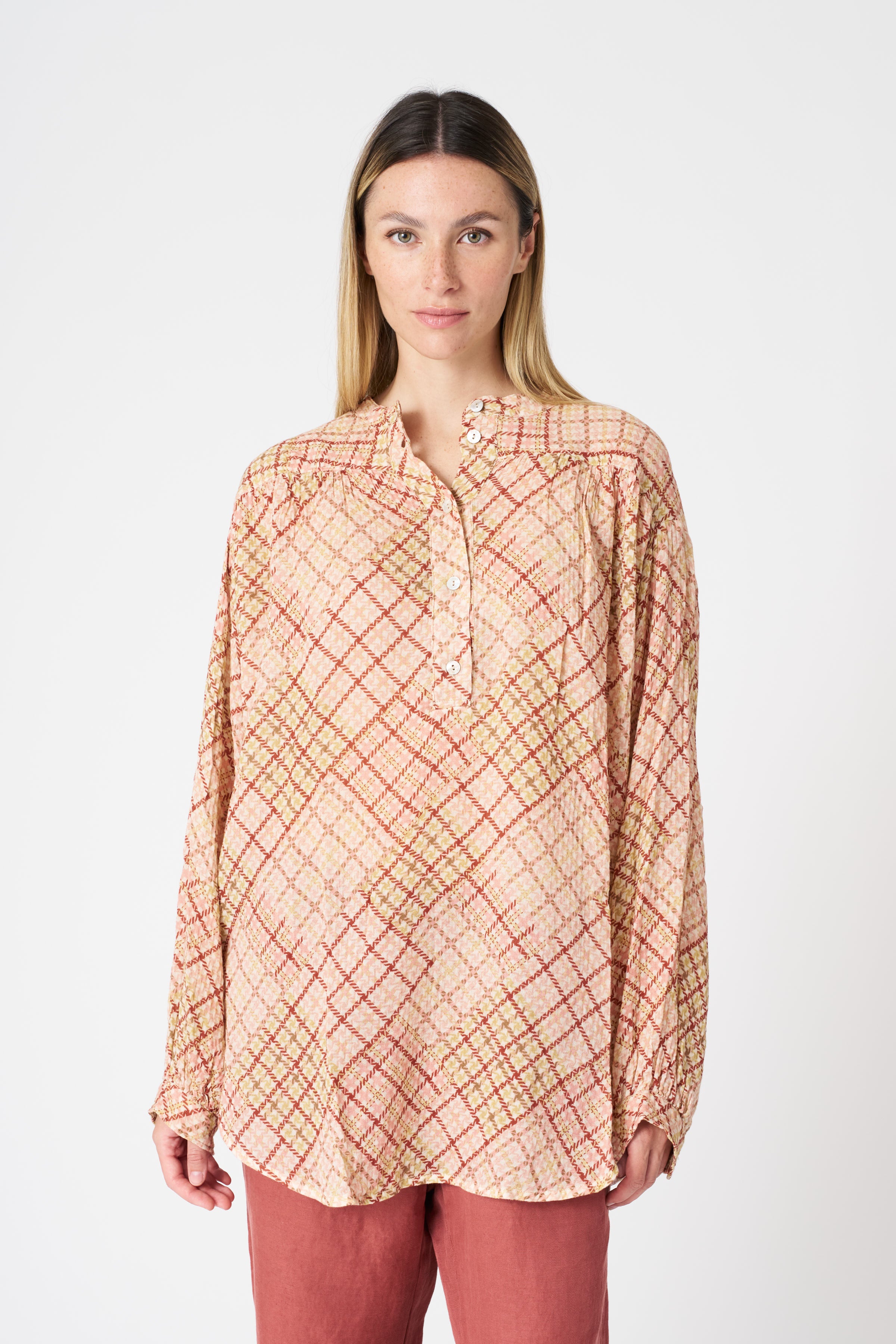 A blouse with natural elegance, crafted from lightweight pure linen that flows softly on the body. The Geometric Pink printed motif adds a refined, distinctive touch, while the relaxed line and partial button closure make it a versatile piece, perfect for both casual chic looks and more sophisticated pairings.