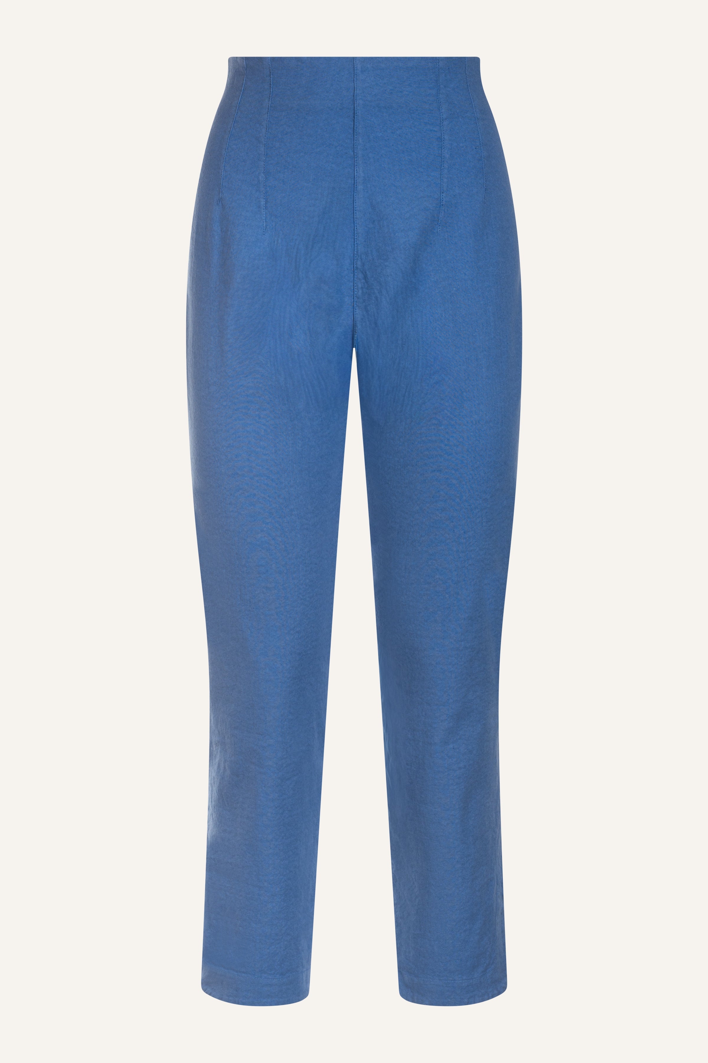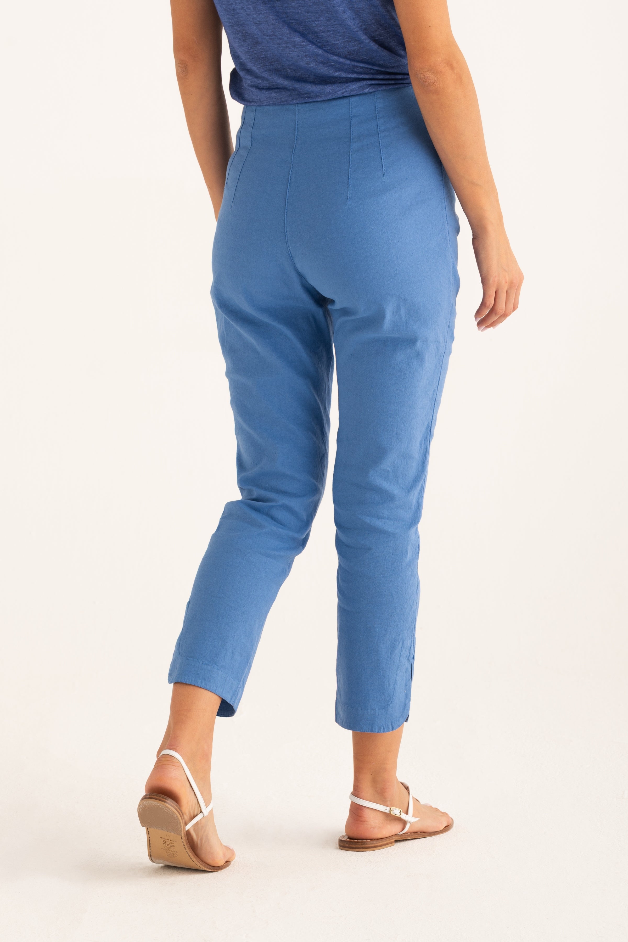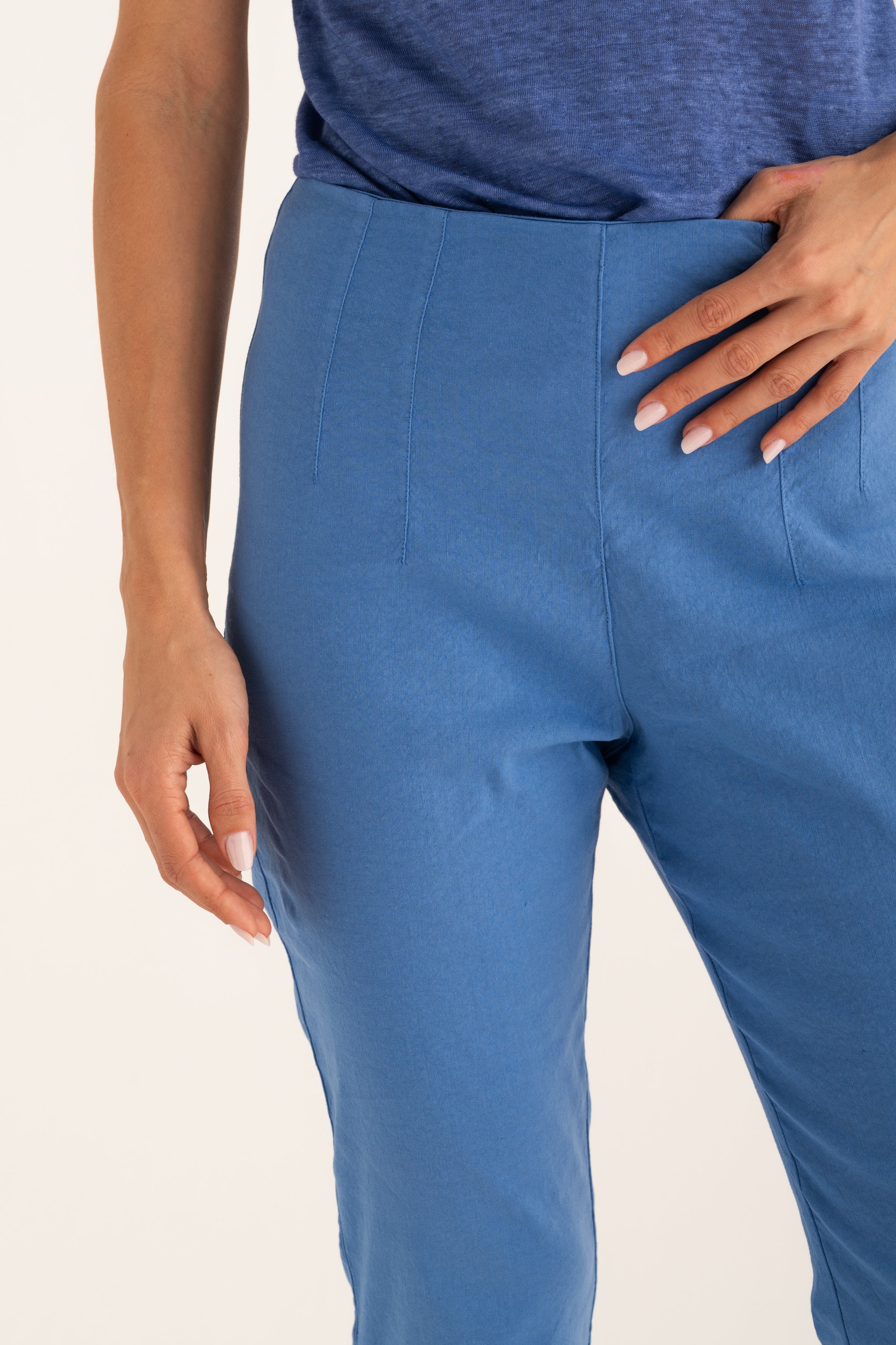 High waisted pants with a clean, essential silhouette, defined by a smooth front that enhances the figure. The invisible side zip offers a discreet closure, while the cropped leg is finished with subtle side slits for a light, contemporary touch. A versatile style designed to elevate everyday dressing with refined ease.