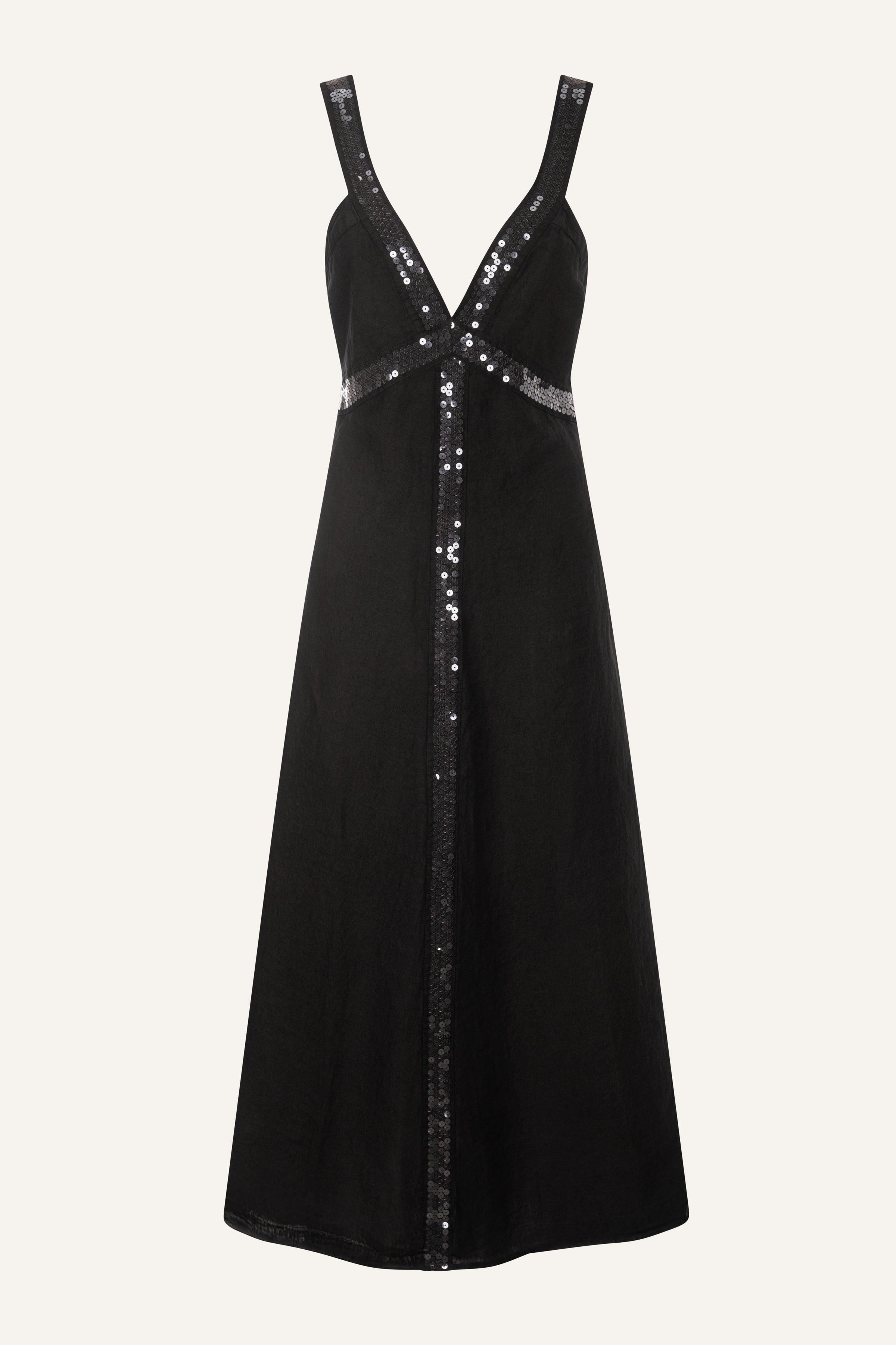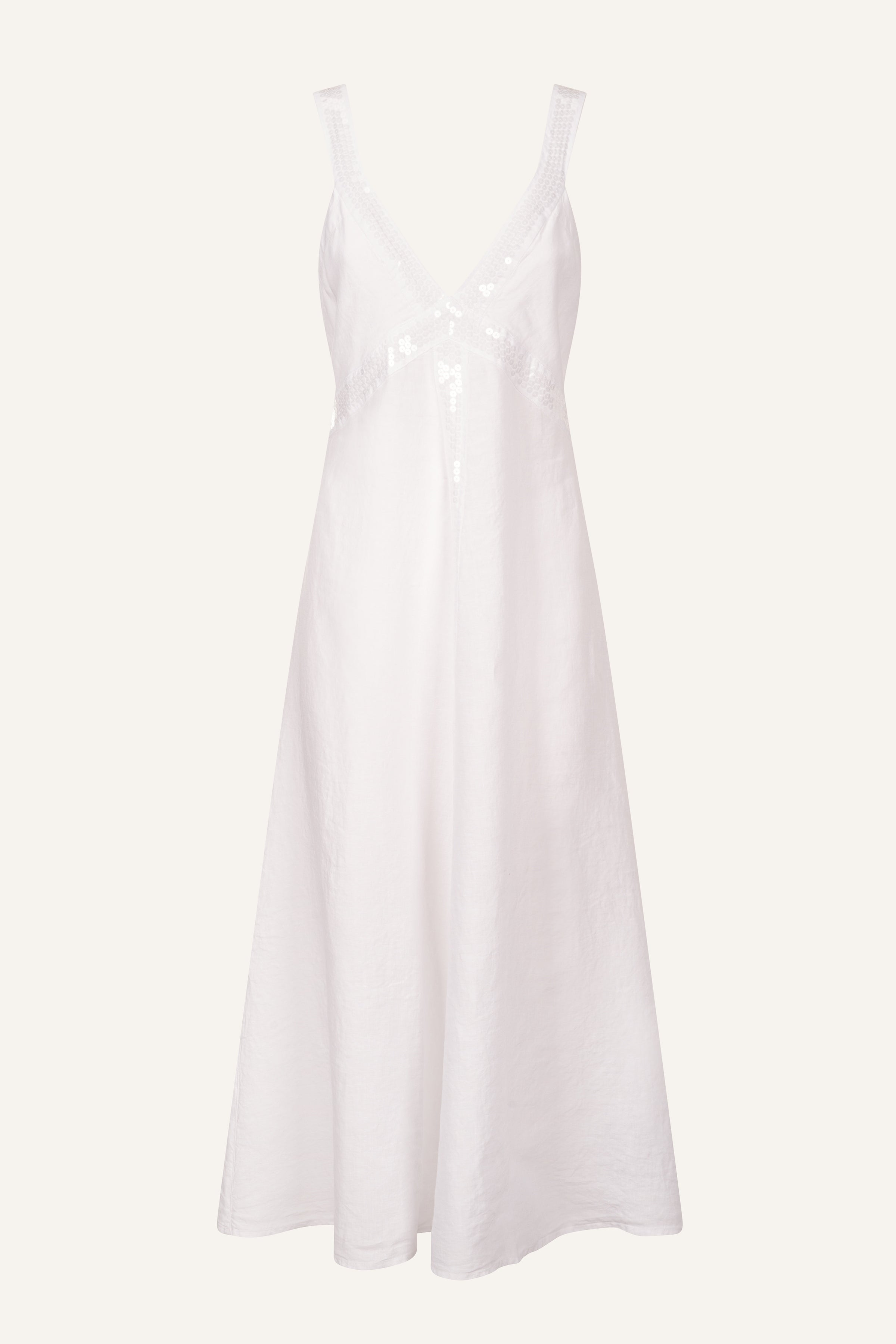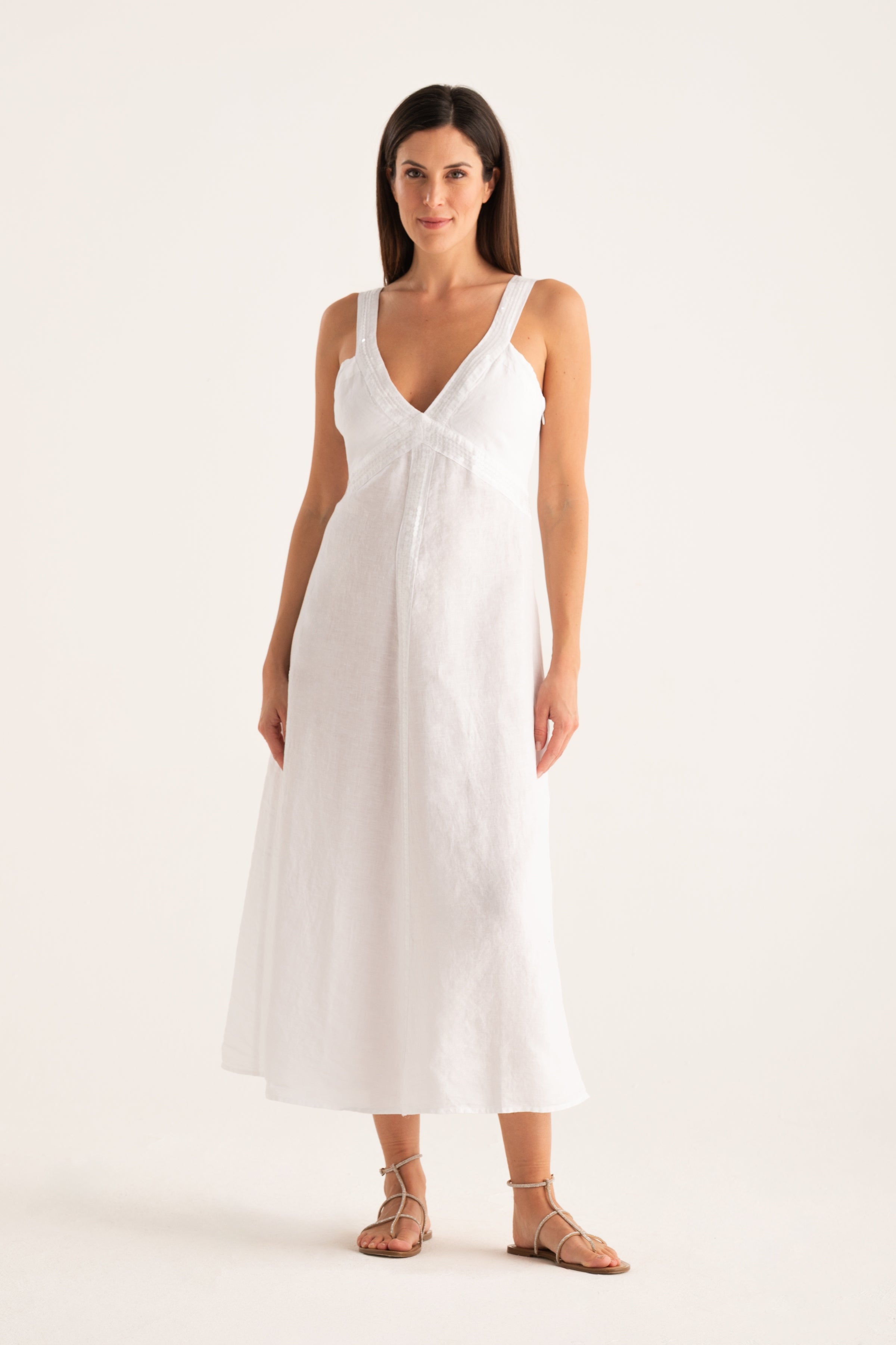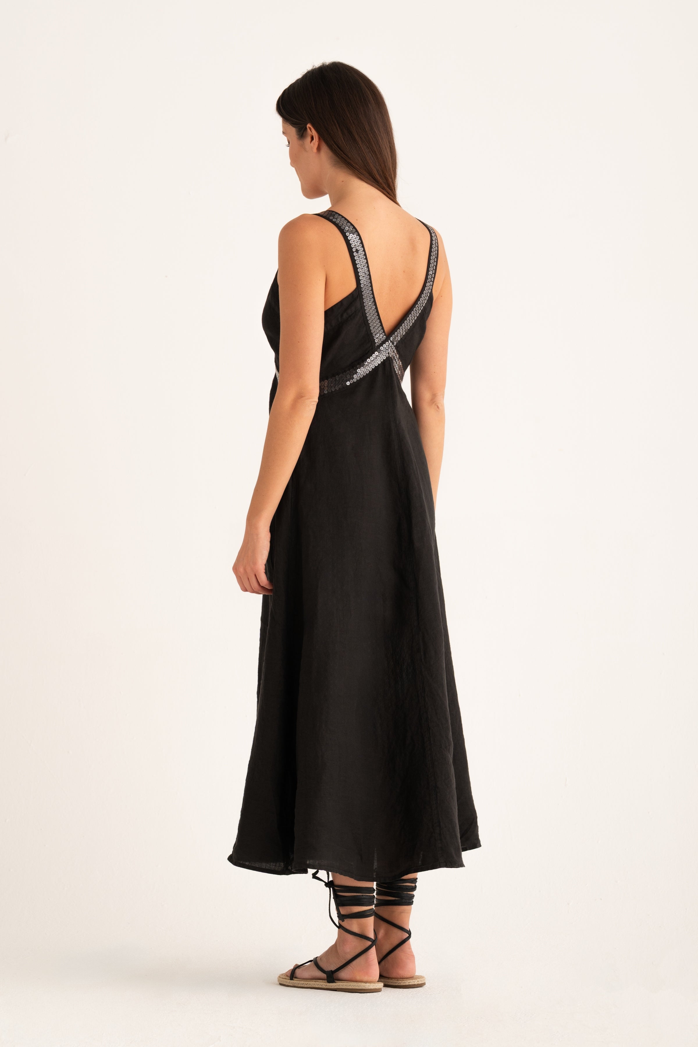 A refined long dress featuring a deep V-neckline and elegant sequin trims that enhance the bust and elongate the silhouette. The flared cut drapes fluidly over the body, while the crossover embellishment adds a luminous, sophisticated touch. Perfect for evening occasions or for elevating summer looks with a statement piece.
