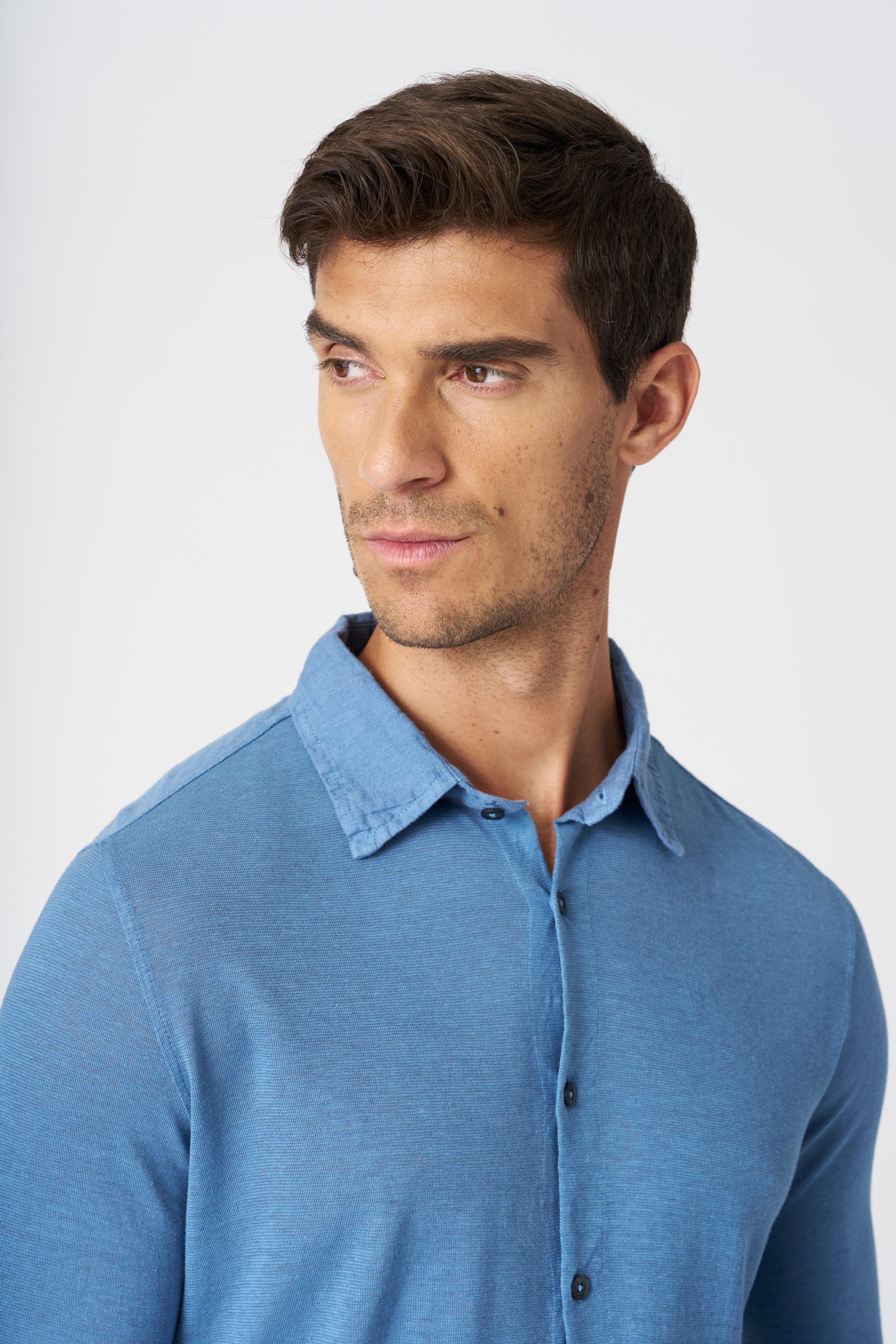 Lightweight knit shirt with a classic collar and button closure. Its clean lines and fine texture make it a refined alternative to the traditional shirt. The slim fit enhances the silhouette while maintaining comfort, perfect for both casual looks and more elegant pairings.