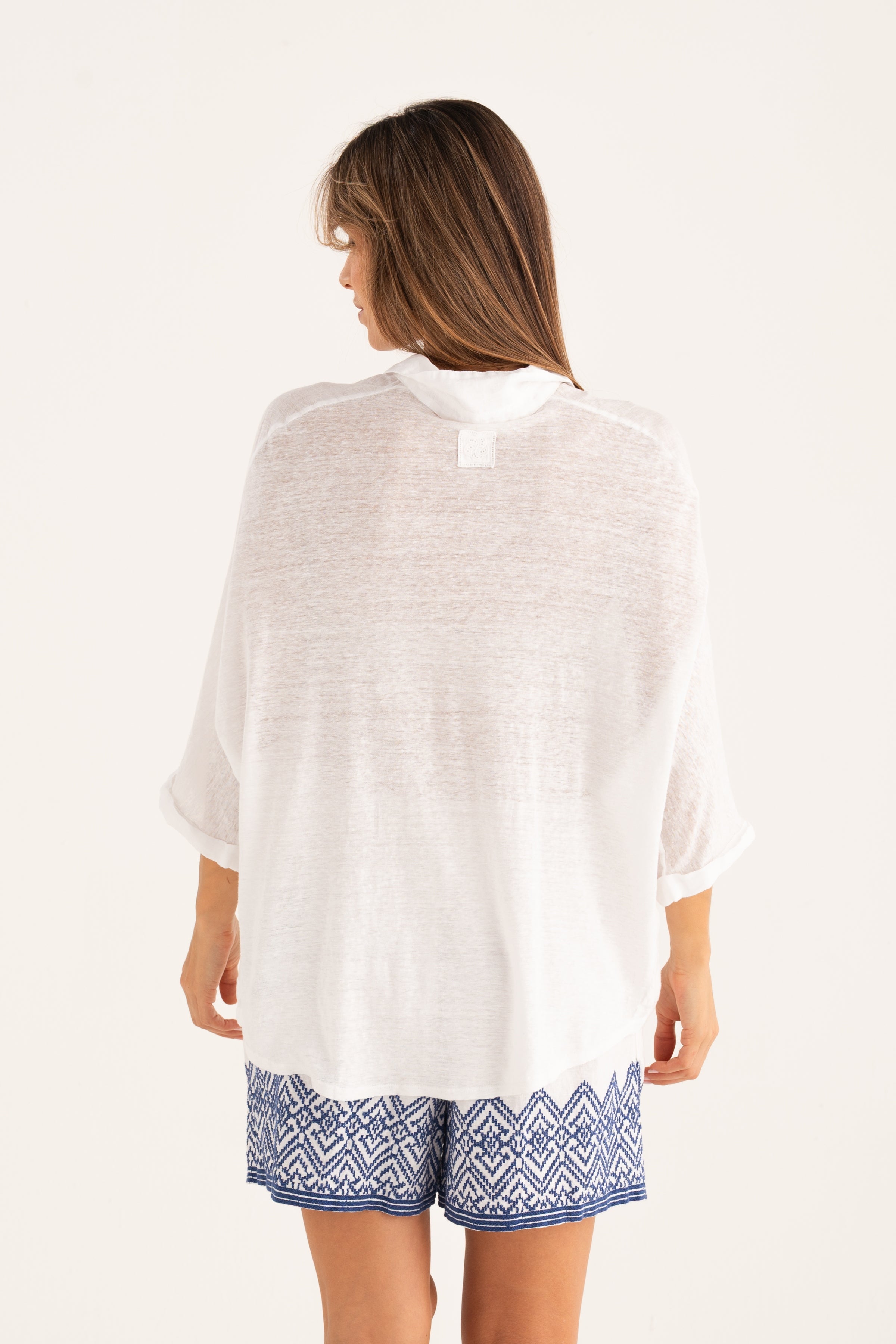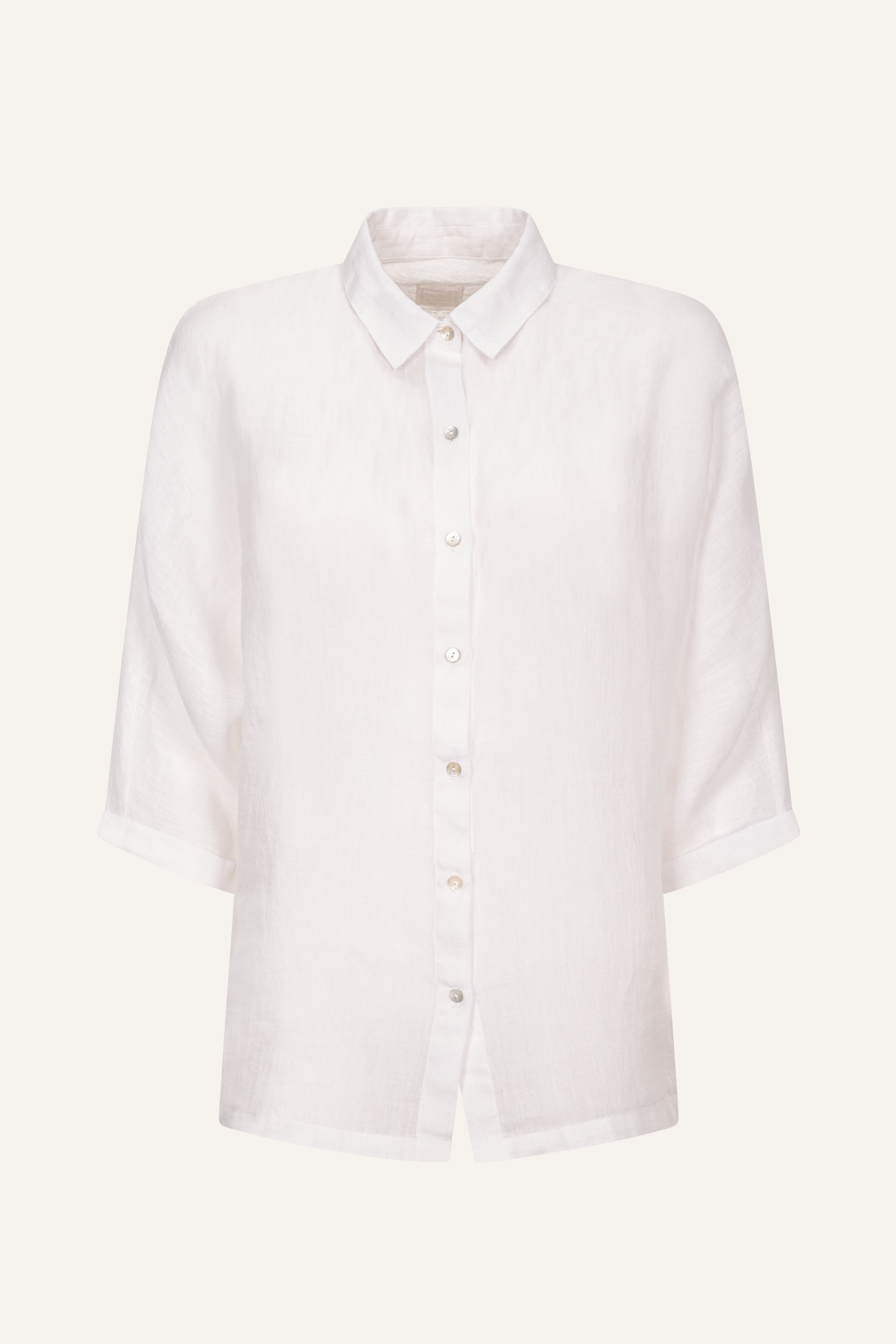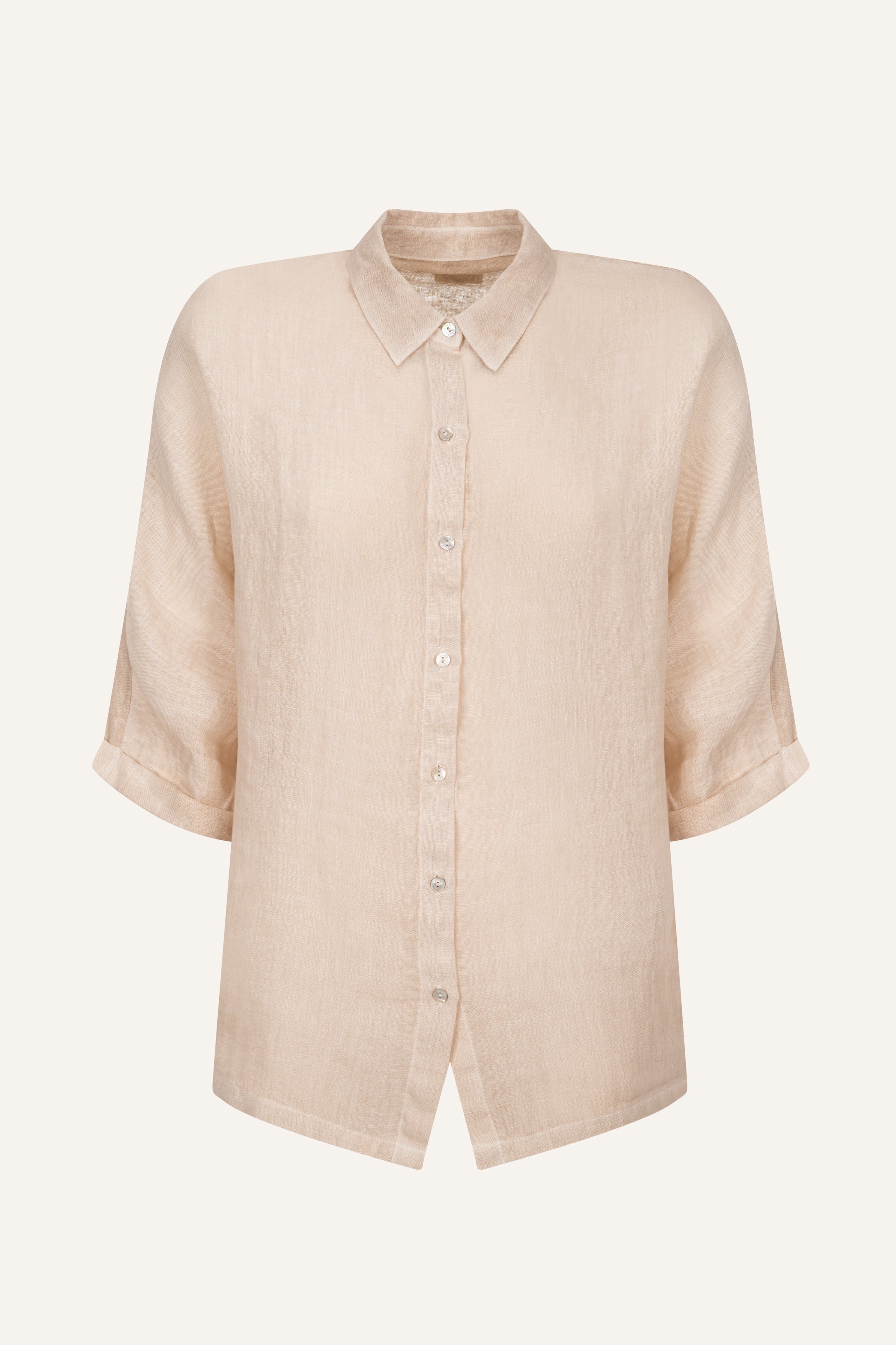 Oversized shirt with a relaxed, easy volume that works as a standalone piece or as a lightweight layer. The wide sleeves with a turned-up finish add a modern, effortless touch, while the classic collar and button-front closure keep the silhouette refined. The rounded hem completes the design, offering movement and versatility.