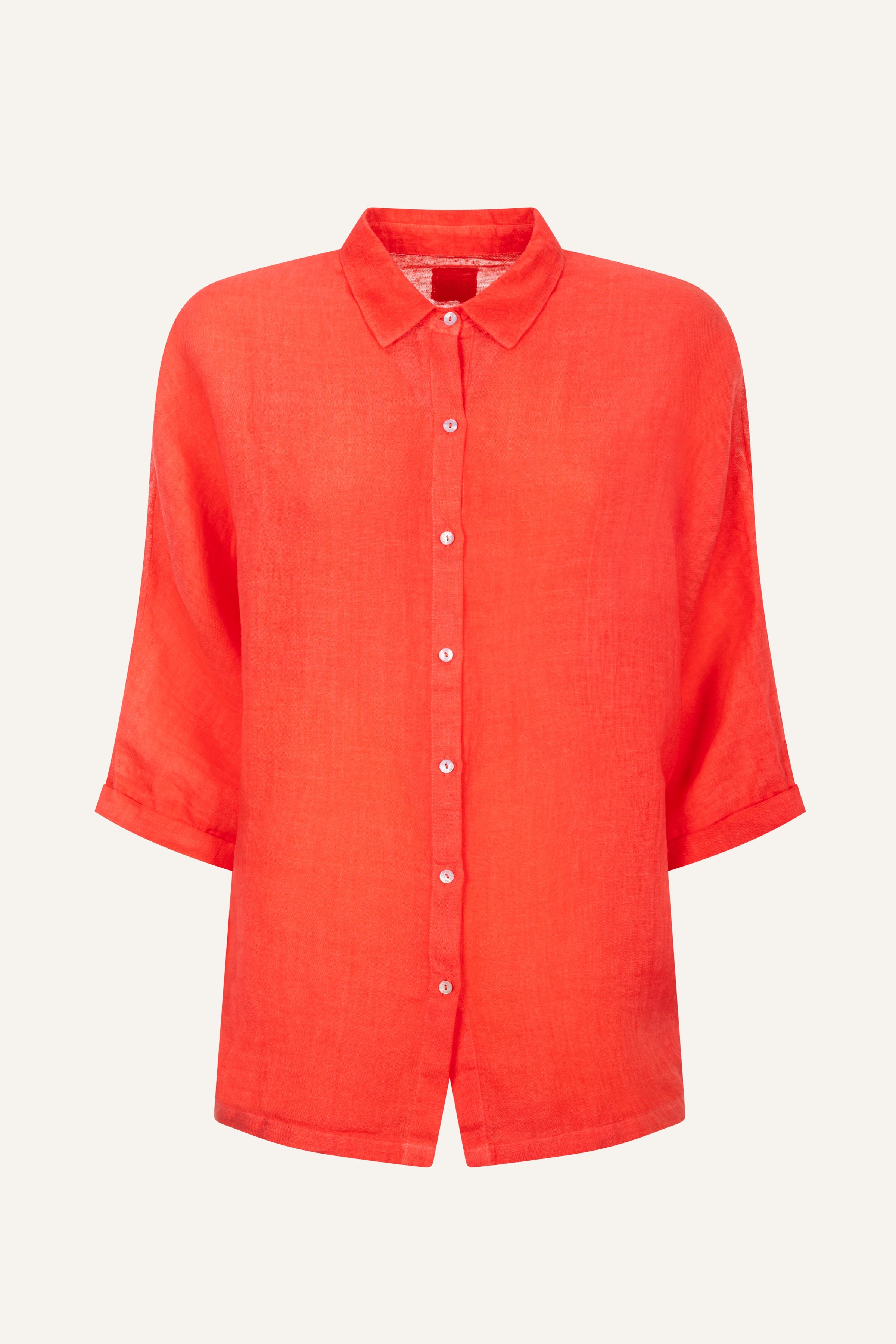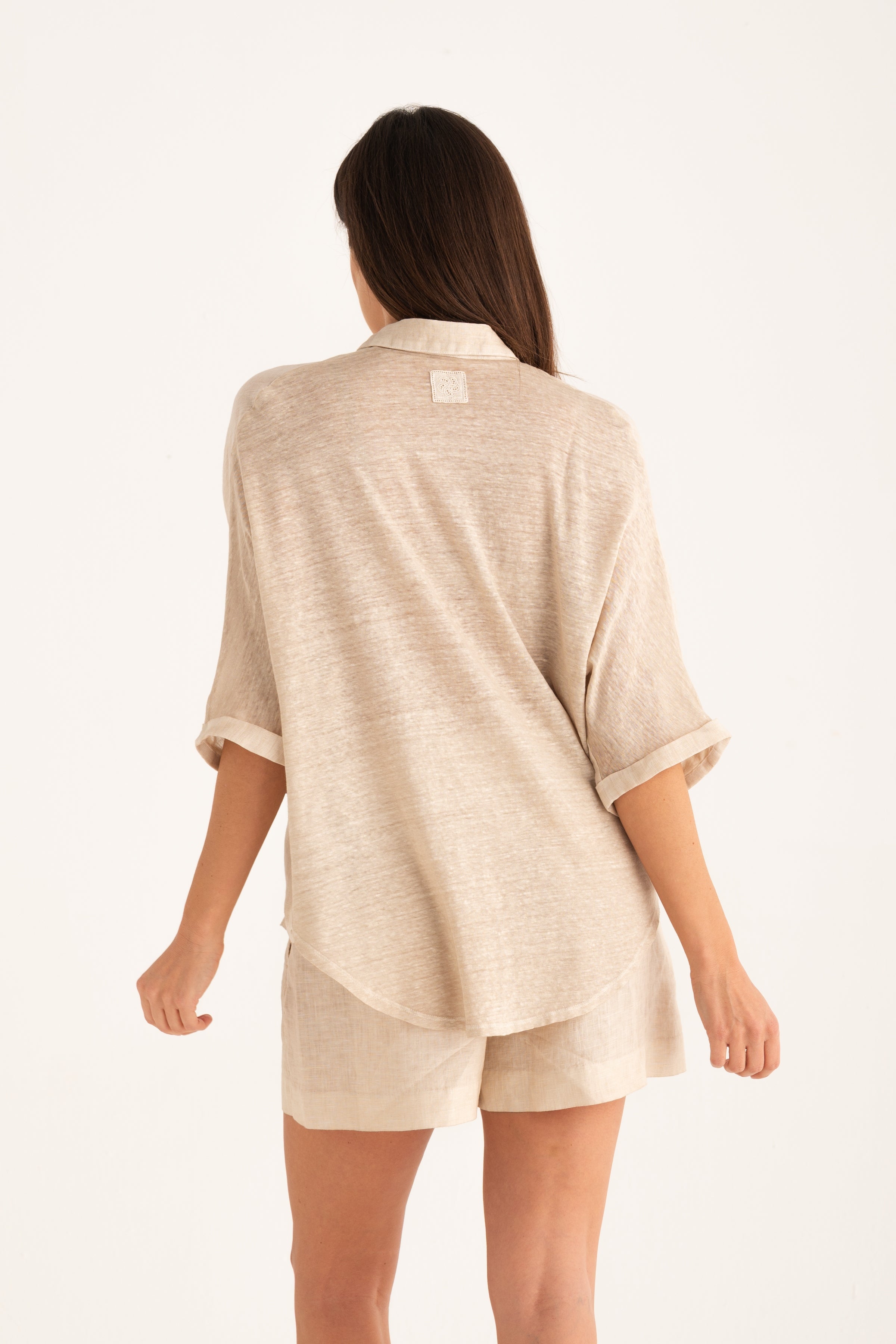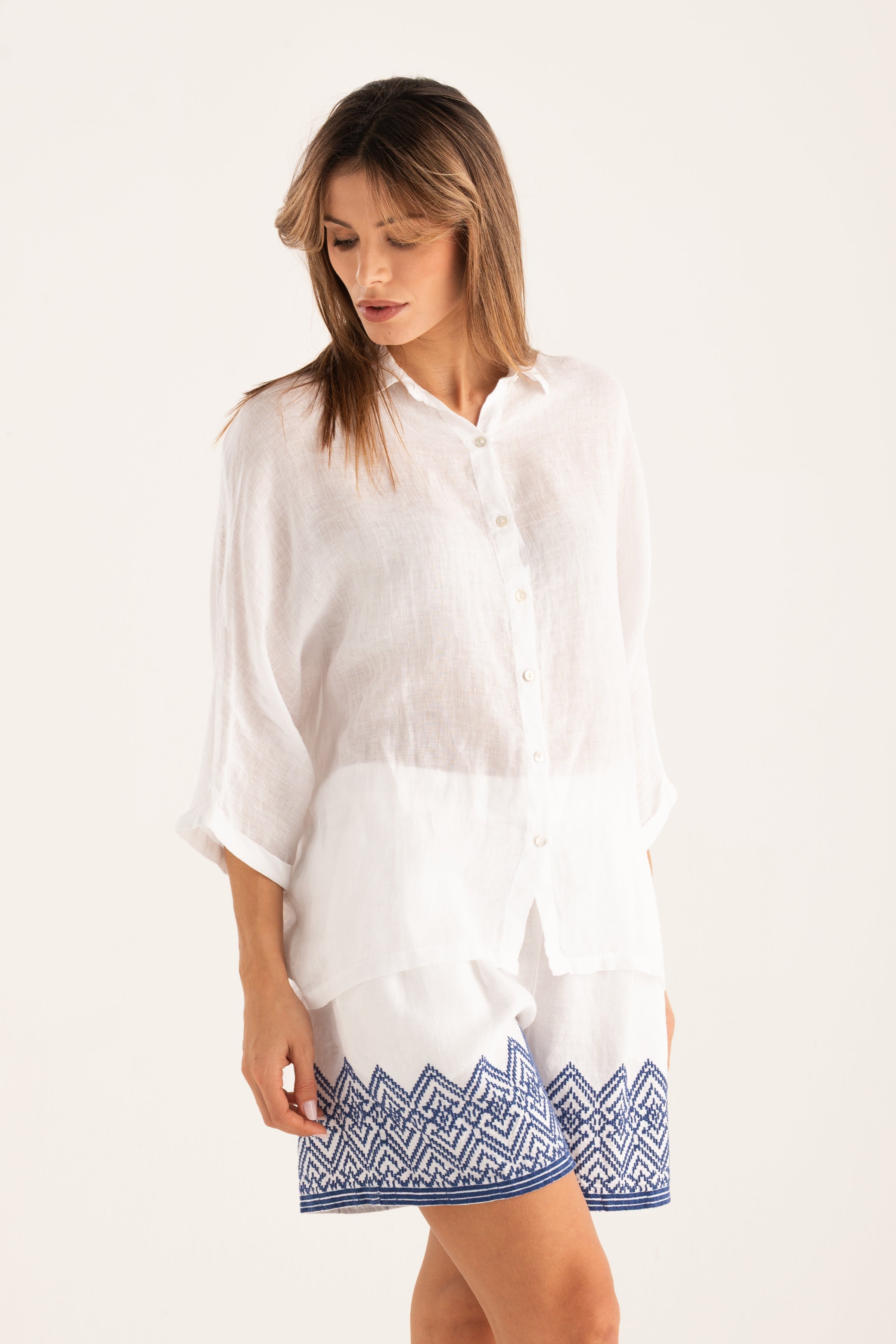 Oversized shirt with a relaxed, easy volume that works as a standalone piece or as a lightweight layer. The wide sleeves with a turned-up finish add a modern, effortless touch, while the classic collar and button-front closure keep the silhouette refined. The rounded hem completes the design, offering movement and versatility.
