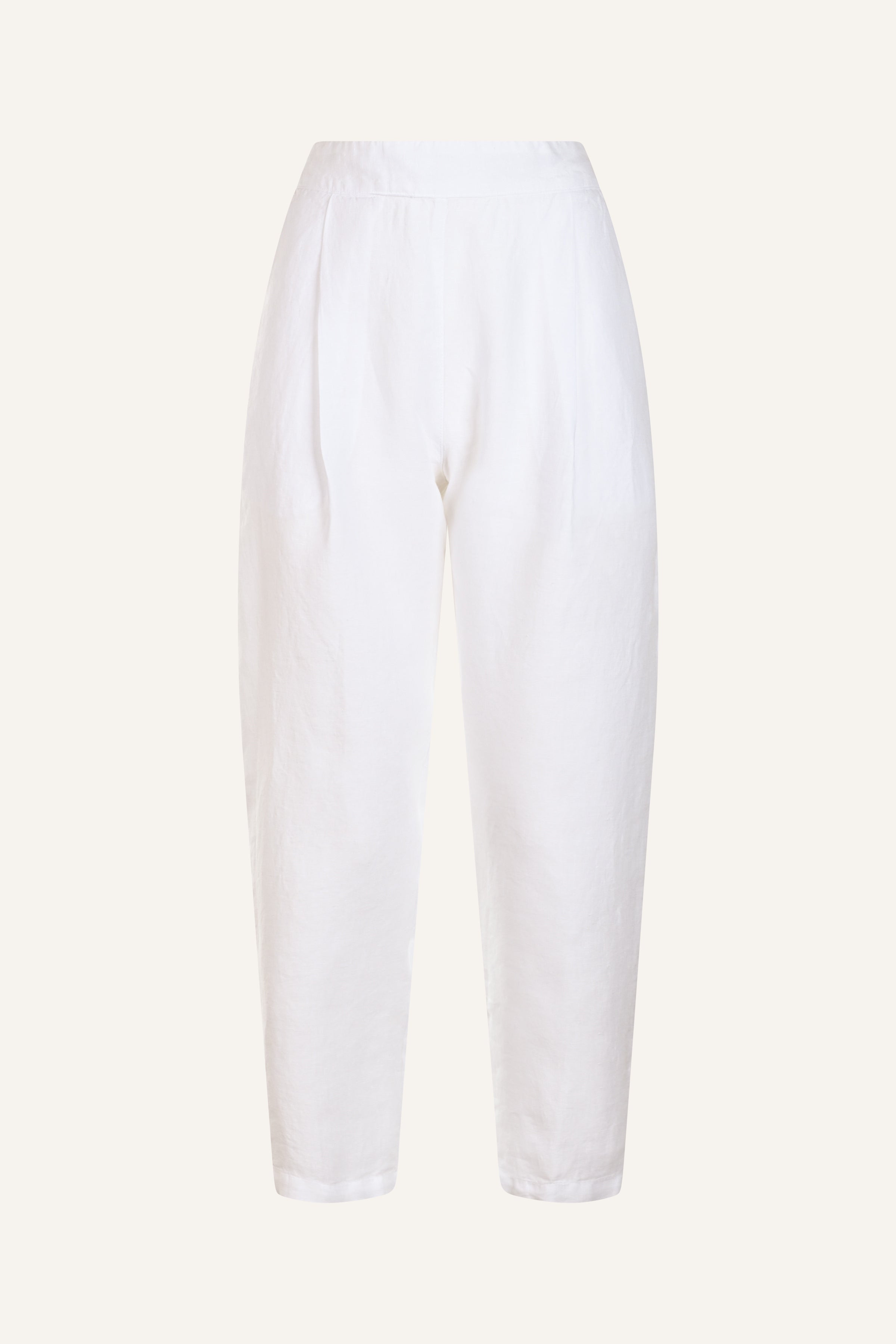 These pants feature a relaxed line with front pleats that add soft volume while keeping the look clean and refined. The back-elastic waistband ensures a comfortable, adaptable fit, and the tapered leg enhances the silhouette with an easy, everyday attitude.