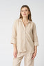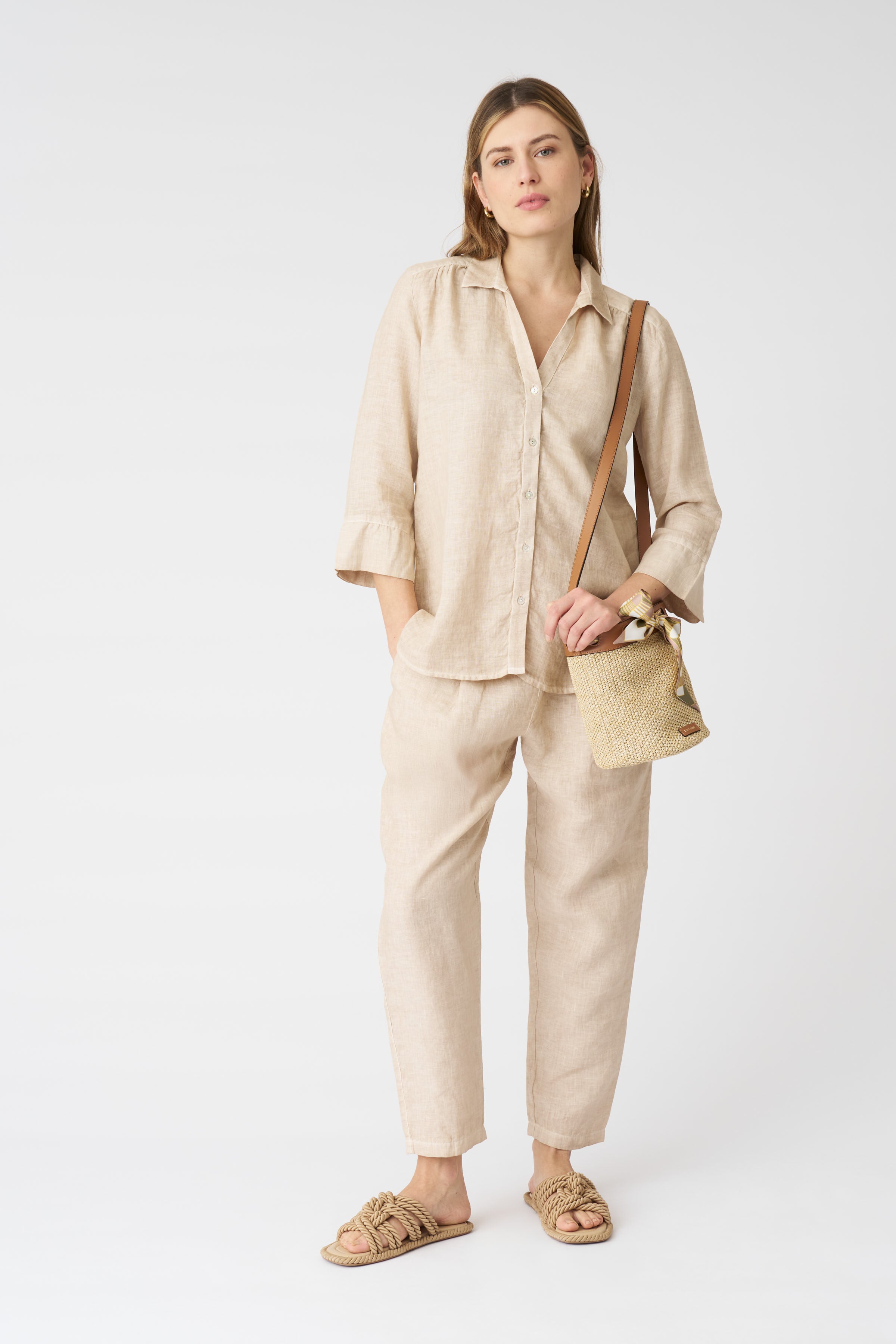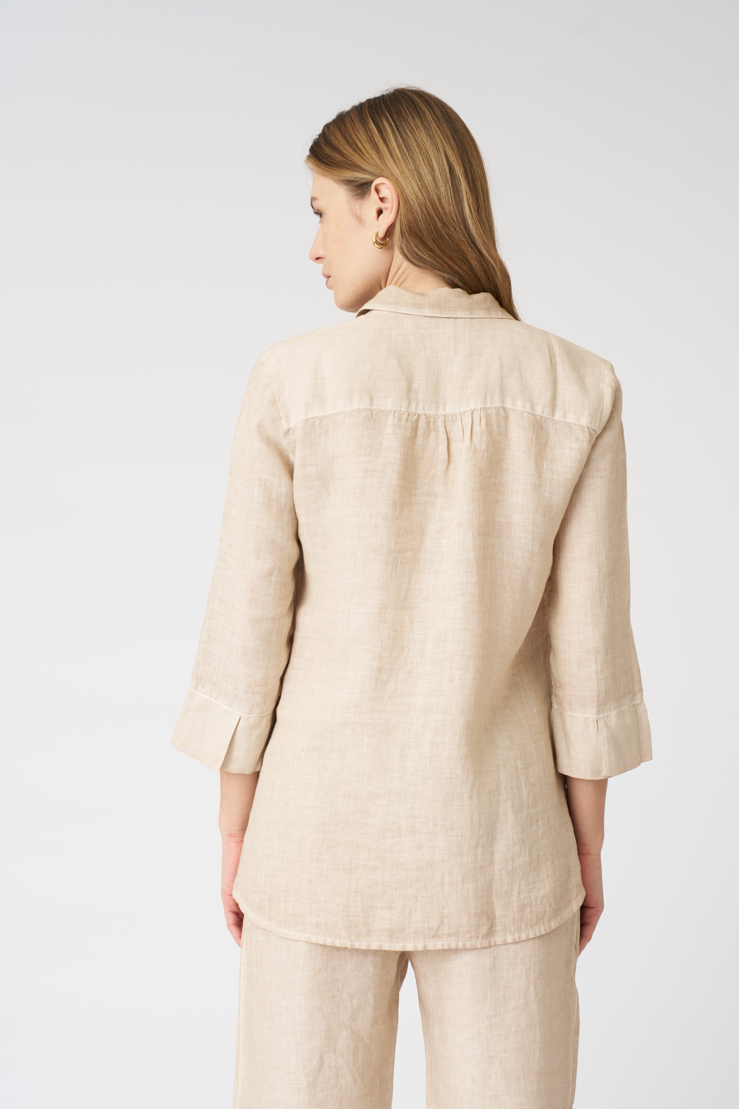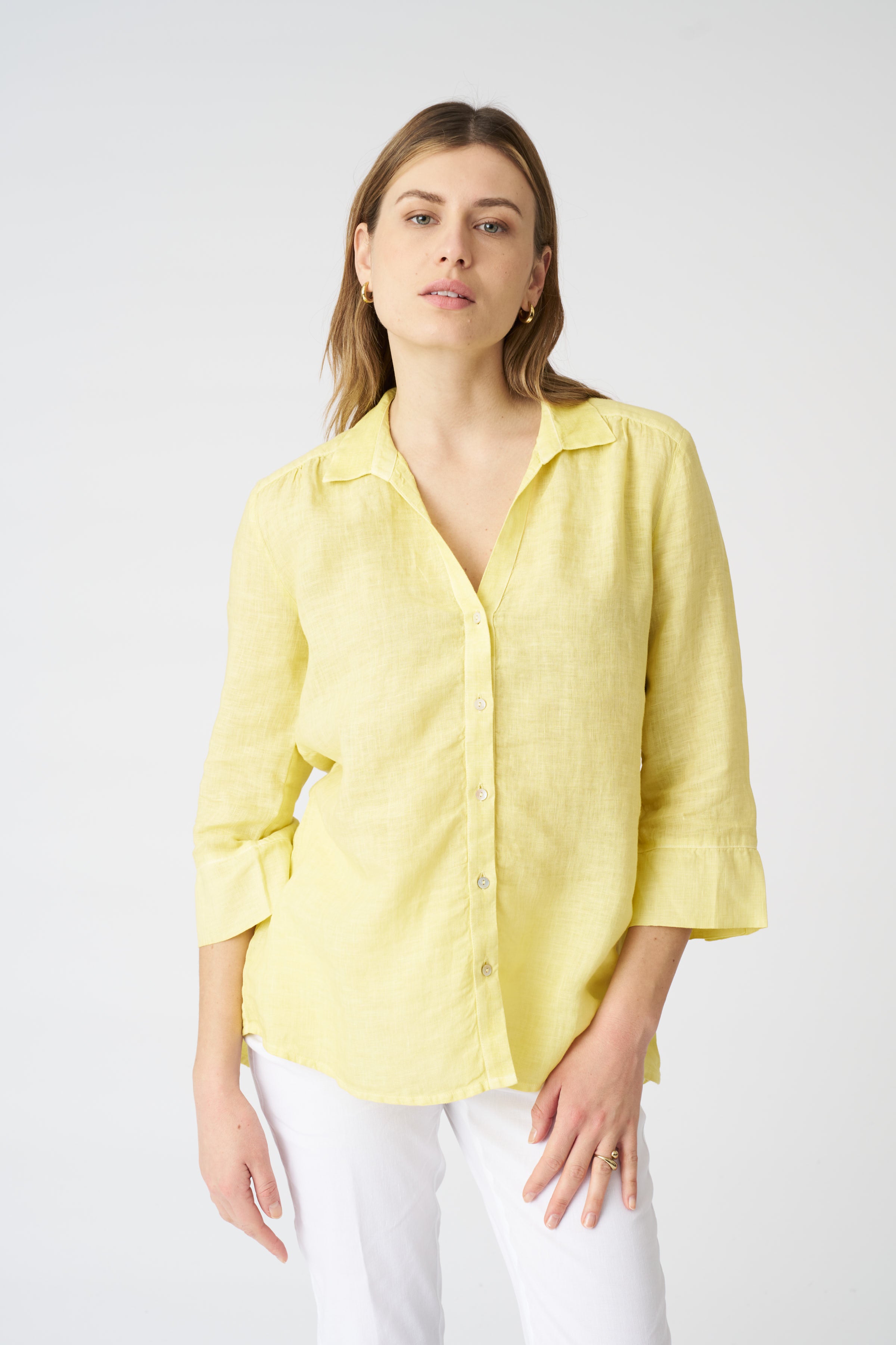 Soft lines and relaxed elegance define this shirt in garment-dyed linen. The V-neck with an open collar creates a fresh, modern silhouette, while the three-quarter sleeves with wide cuffs add a refined touch. A versatile piece with a regular fit, perfect for wearing with ease from morning to evening.