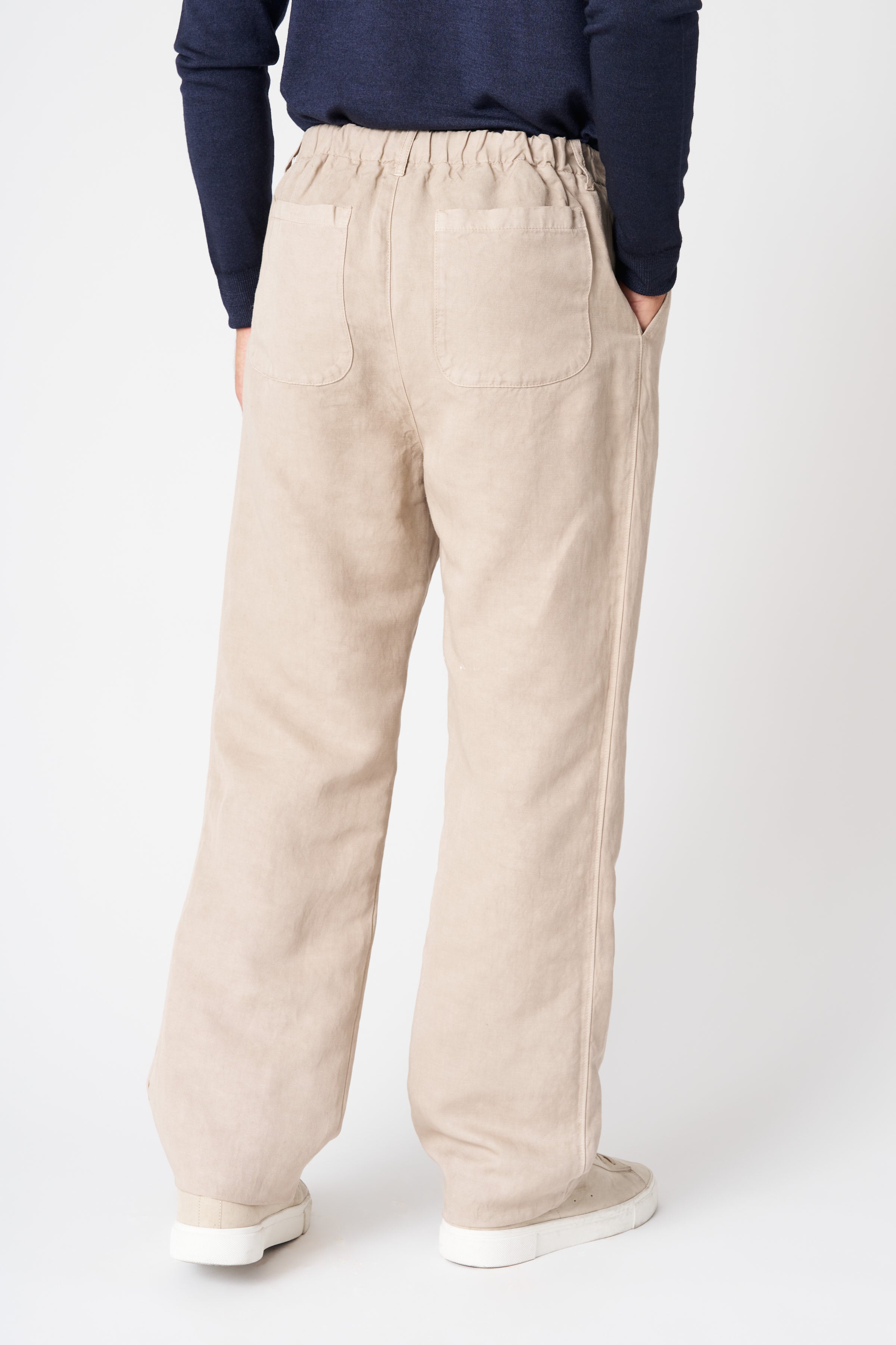 Relaxed-fit trousers with an elastic waistband and a practical front button closure. The patch pockets on the back add a functional detail while maintaining a clean look. A versatile and comfortable piece, perfect for everyday wear that combines practicality and style.