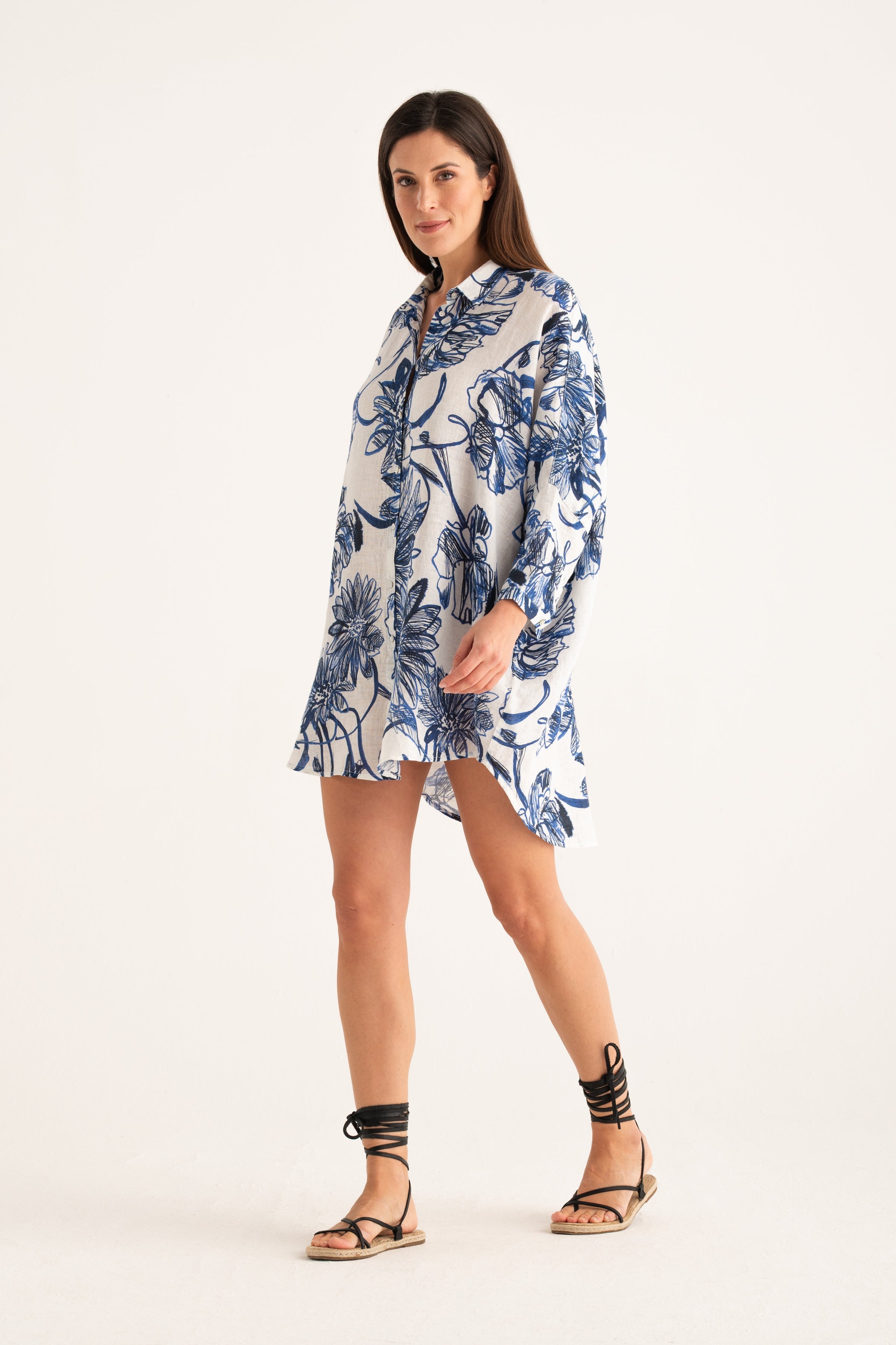 A relaxed, oversized shirt that can also be worn as a short dress. The Air print adds a fresh, contemporary character, while the fluid silhouette allows you to style it open as an overshirt or closed as a mini dress.