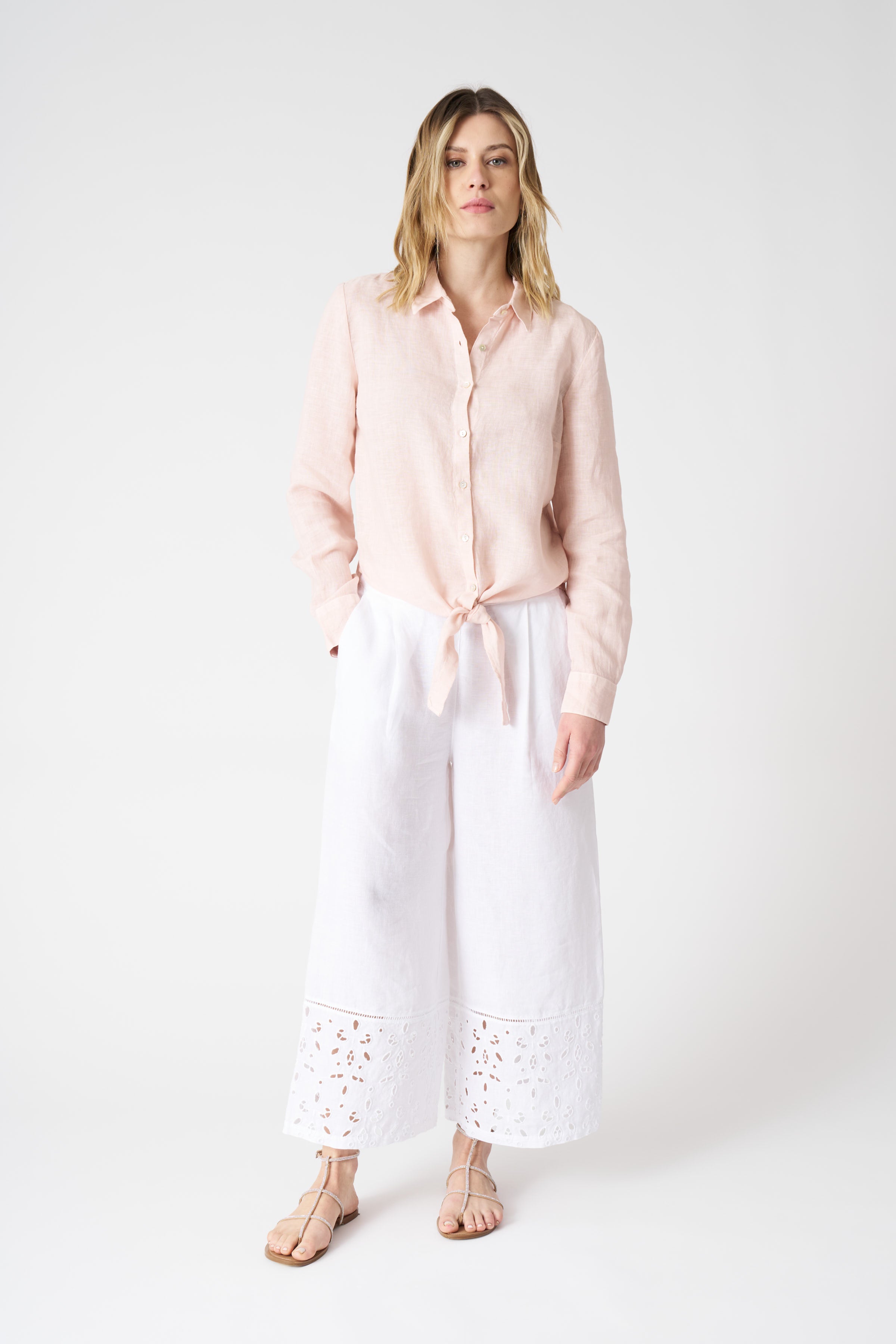 A fresh and refined shirt, perfect for enhancing your summer outfits. Crafted from lightweight, breathable linen, it features a stylish tie-front detail that adds a touch of playfulness and modernity to the design. Its classic collar and long sleeves ensure versatility, making it suitable for both casual looks and more polished occasions.