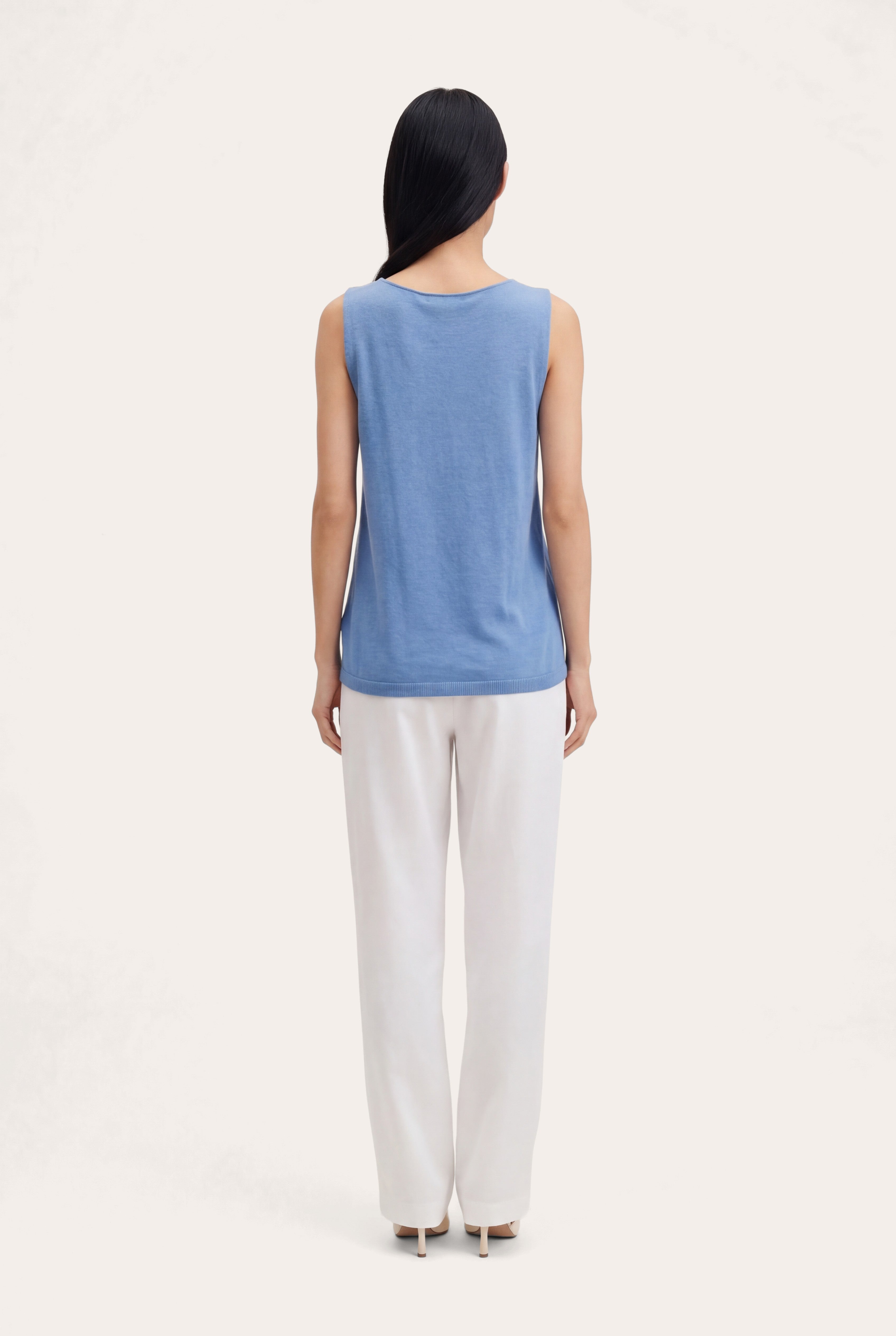 A sleeveless knit top with a clean, refined silhouette and a soft, lightweight texture that drapes naturally on the body. The ribbed hem adds a subtle, polished detail, making it a versatile piece to wear on its own or layered with ease.