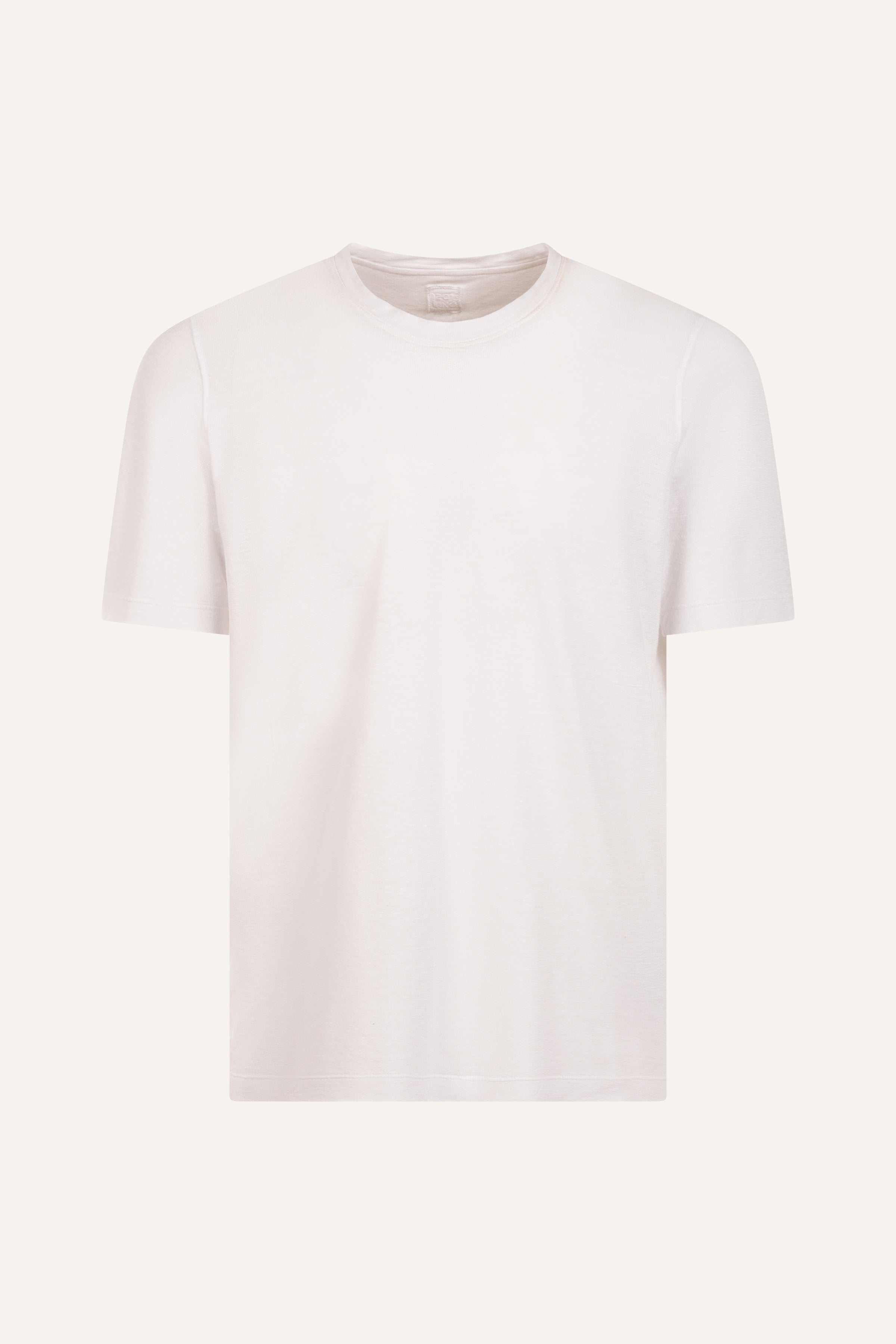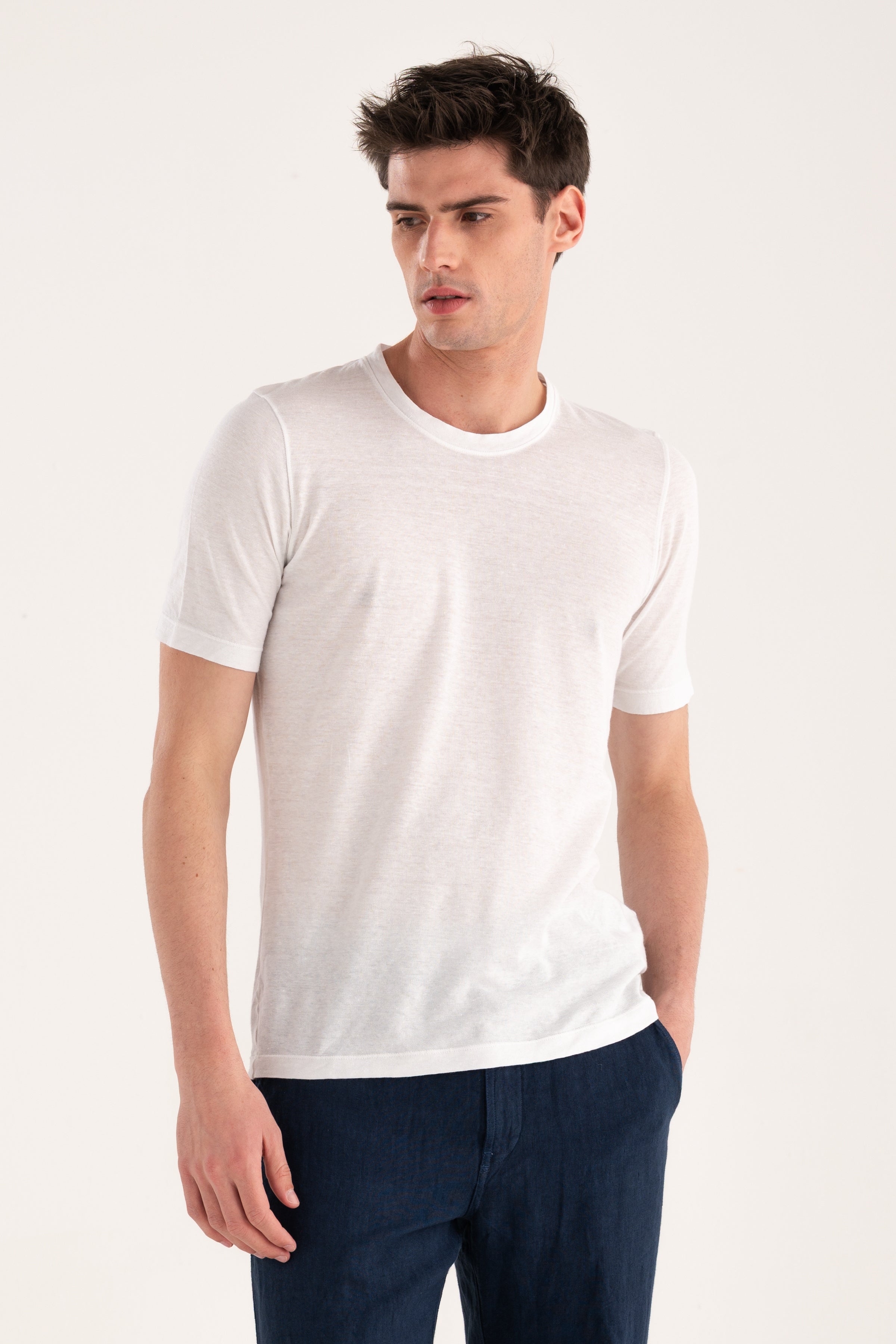 A slim-fitting T-shirt designed to enhance the silhouette while maintaining the natural lightness of slub-textured pure linen. The clean crew neckline and subtle irregular texture give it a modern, relaxed attitude—perfect for elevated everyday looks.