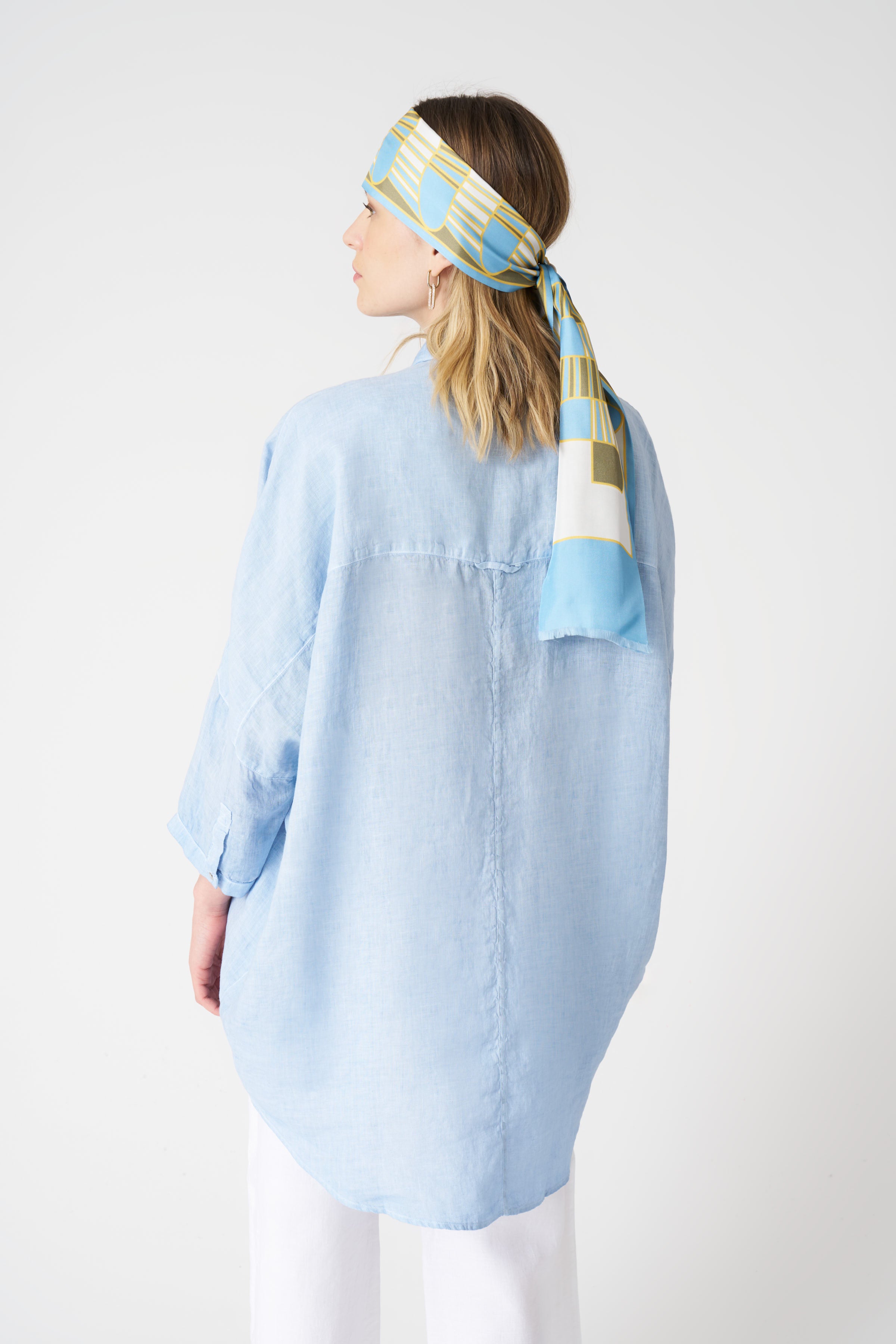A lightweight and breezy shirt that combines comfort and style, perfect for summer days. The oversized design ensures a relaxed fit, while the longer back hem adds a modern and refined touch. Ideal to pair with wide-leg trousers for a casual-chic look or to wear over swimwear for a beach-ready outfit.